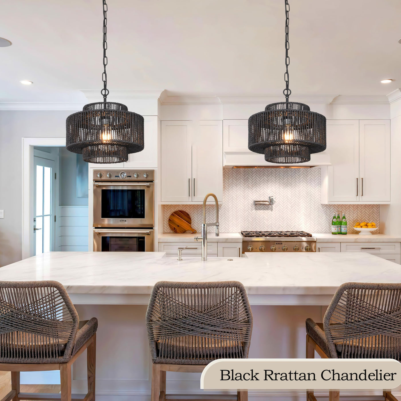 Bagood 12.4'' Black Woven Pendant Light 1 Light Black Rattan Chandelier Black Hand-Woven Rattan Chandelier 3-Tier Rattan Black Pendant Farmhouse Chandelier Light Fixture For Dining Room Living Room