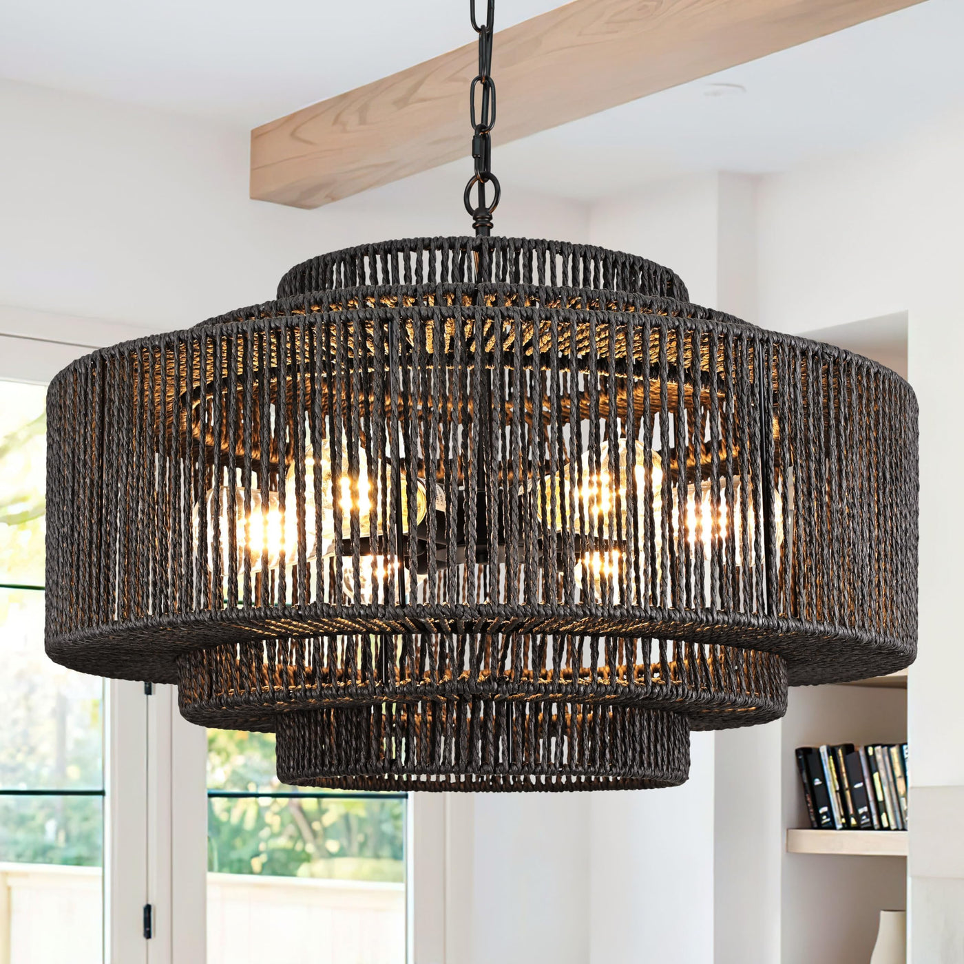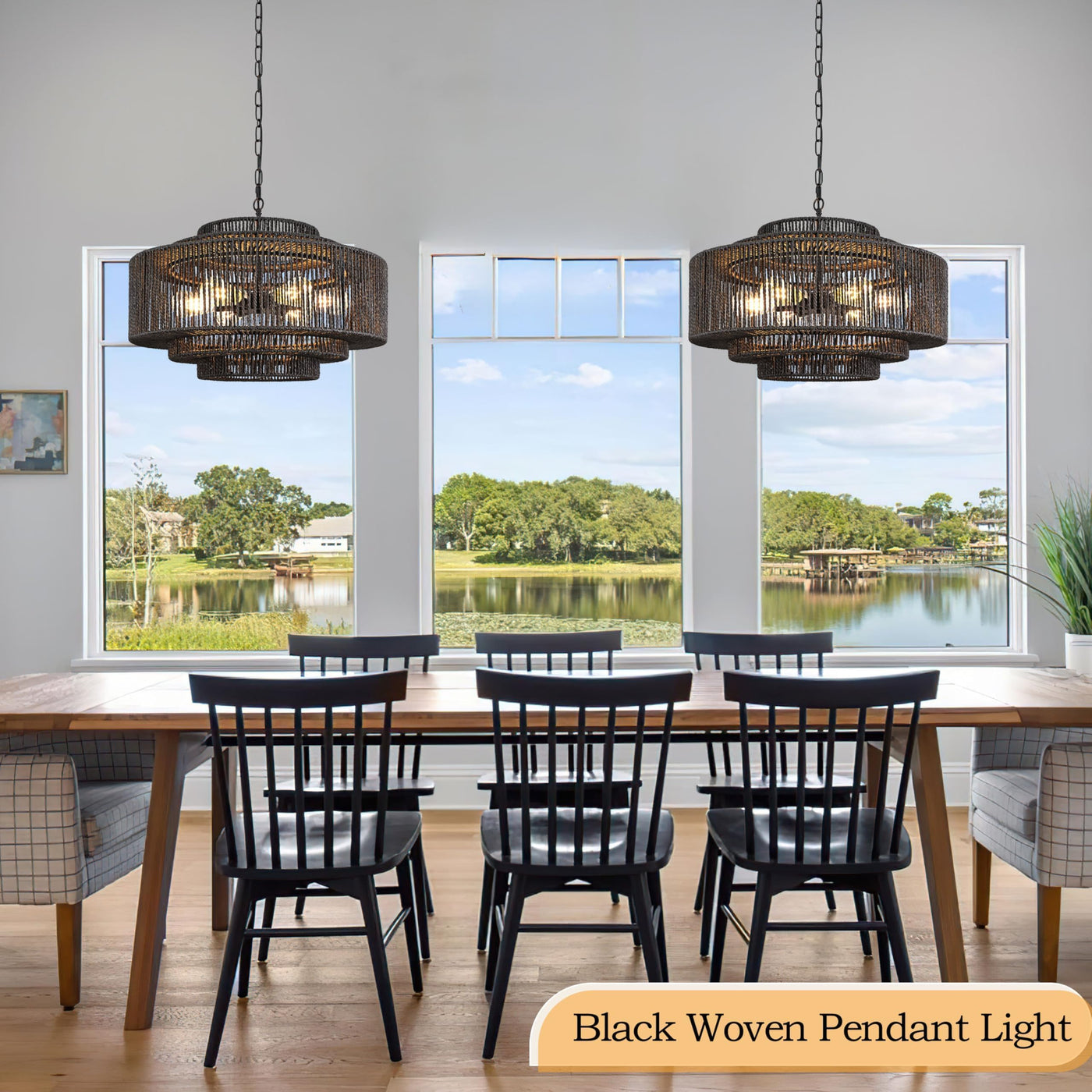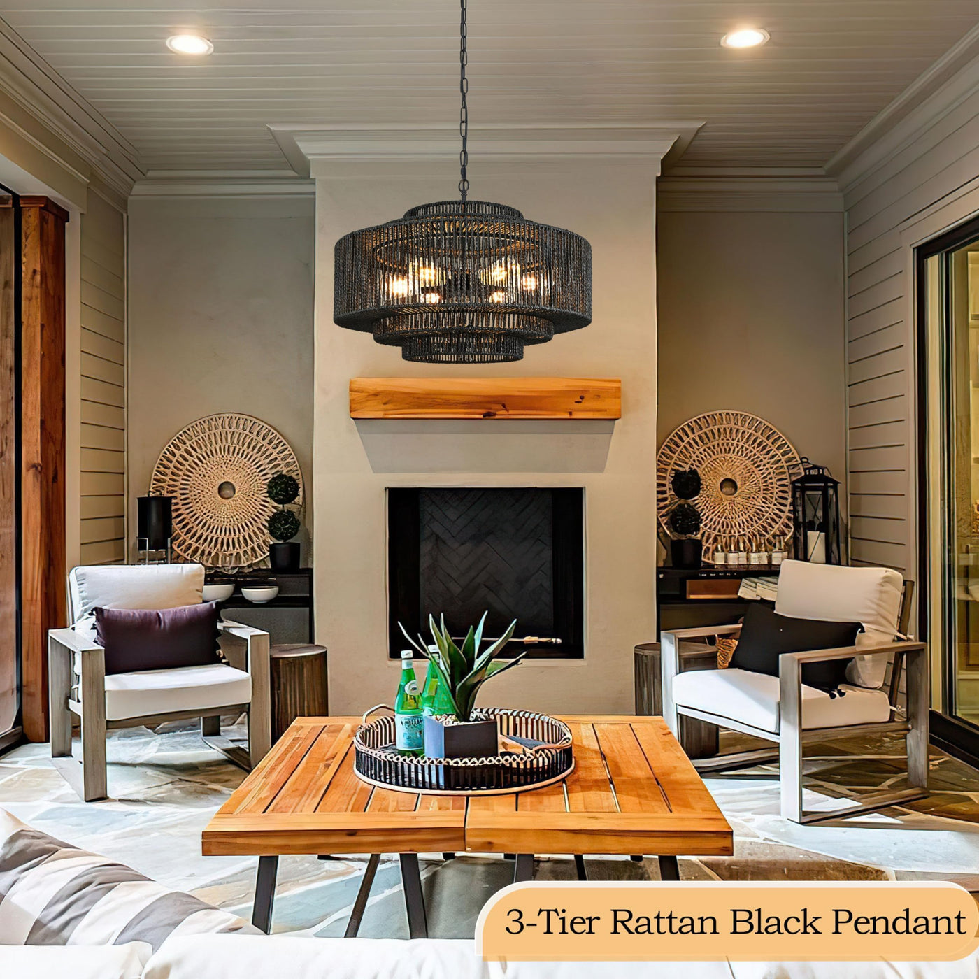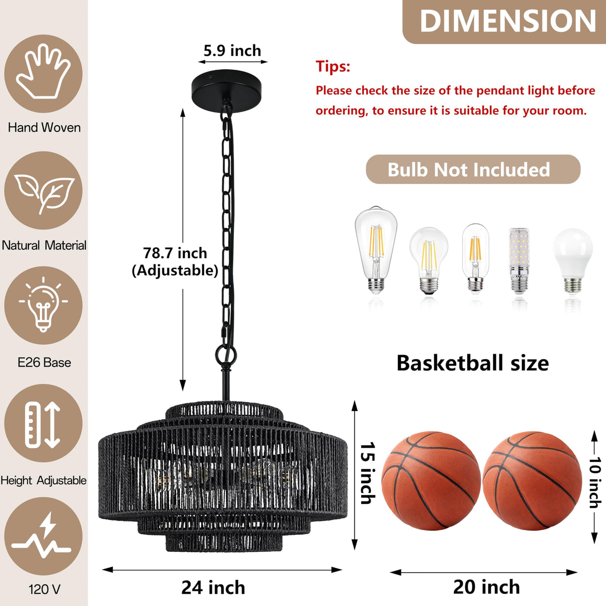 Bagood 24'' Rattan Pendant Light Black Rattan Chandelier Light Fixture 3-Tier Hand-Woven Rattan Chandelier Wicker Pendant Light