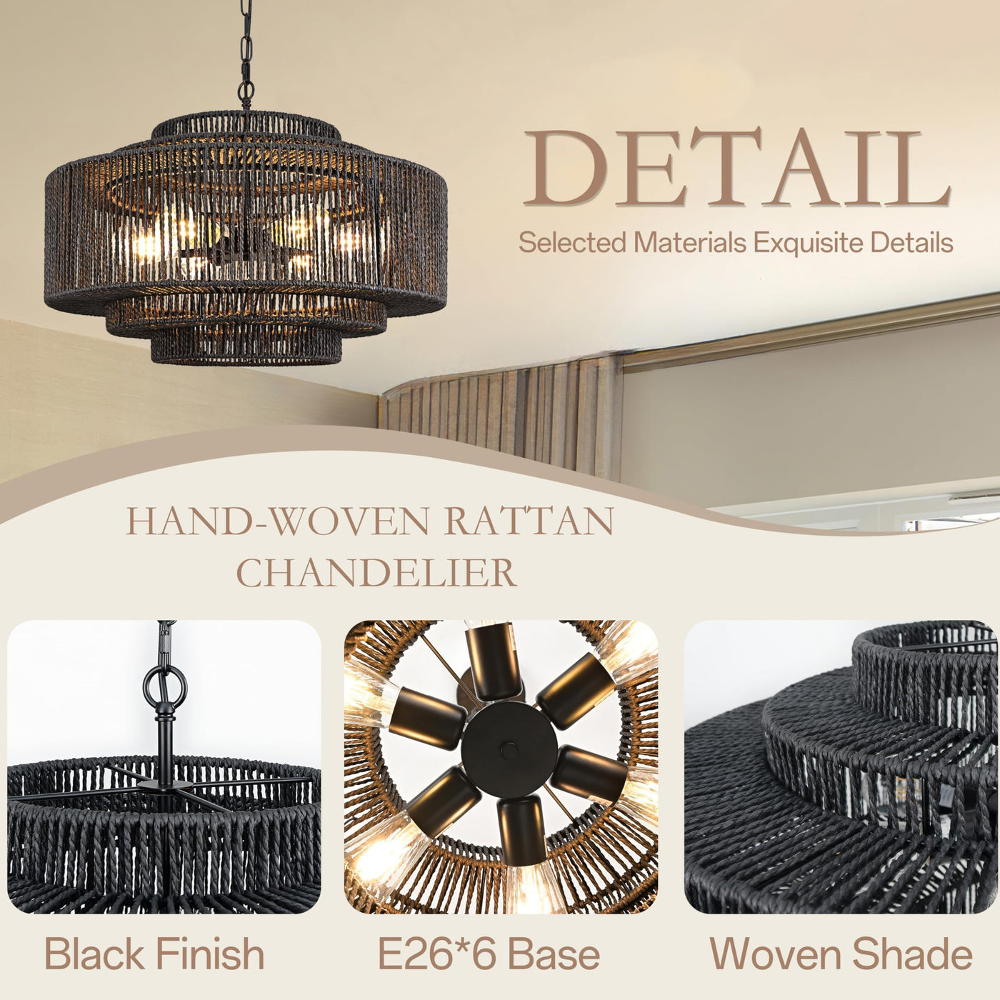 Bagood 24'' Rattan Pendant Light Black Rattan Chandelier Light Fixture 3-Tier Hand-Woven Rattan Chandelier Wicker Pendant Light 6 Light Boho Pendant Light Rustic Light Fixtures for Dining Room Bedroom