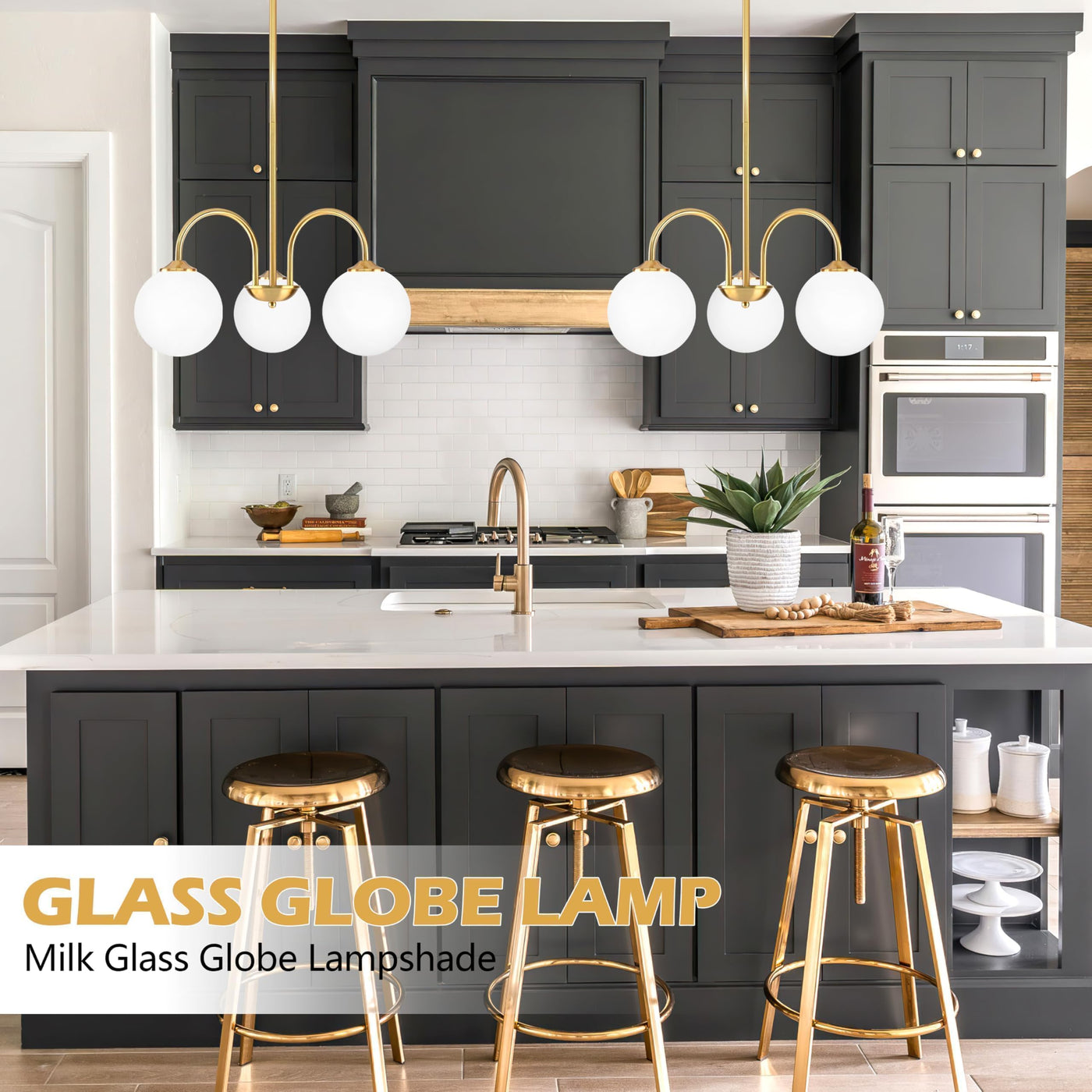 Bagood 20'' 3-Light Modern Globe Sputnik Chandelier Mid Century Large Glass Gold Sputnik Pendant Lights Kitchen Island Vintage Milk Glass Dining Room Chandelier Brushed Brass Hanging Light Fixture
