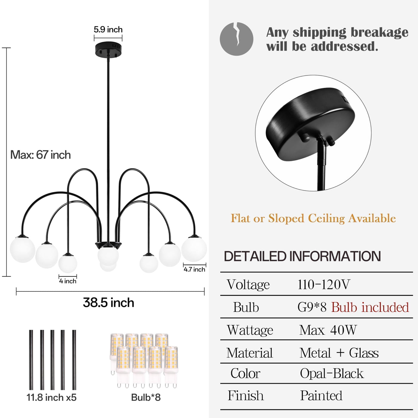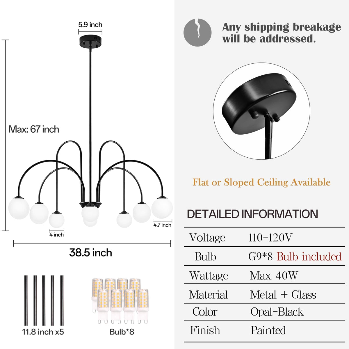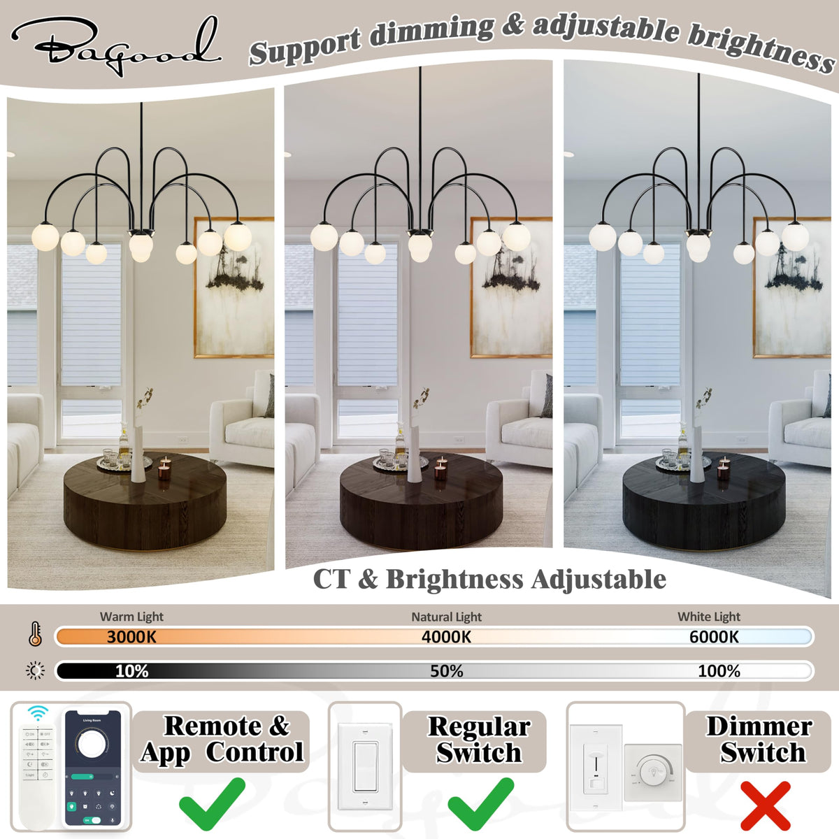Bagood 8-Light Modern Sputnik Chandelier Mid Century Large Glass Black Sputnik Chandeliers Large Frosted Globe Chandelier Milk Glass Pendant Light Fixtures Semi Flush Mount Chandelier for Dining Room