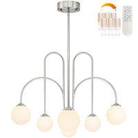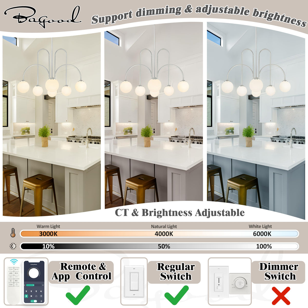 Bagood Nickel 6-Light Globe Chandelier Light Fixture Modern Sputnik Chandelier Dimmable Chandelier With White Globe Glass 29.5 Dining Room Light Fixture For Bedroom Kitchen (G9 Bulb & Remote Incl.)