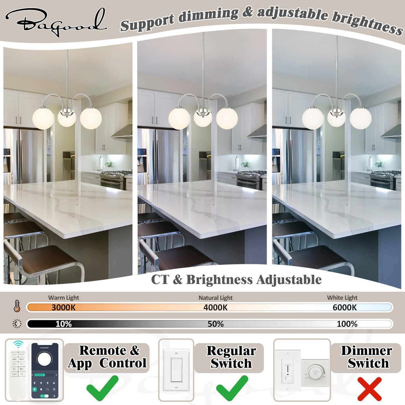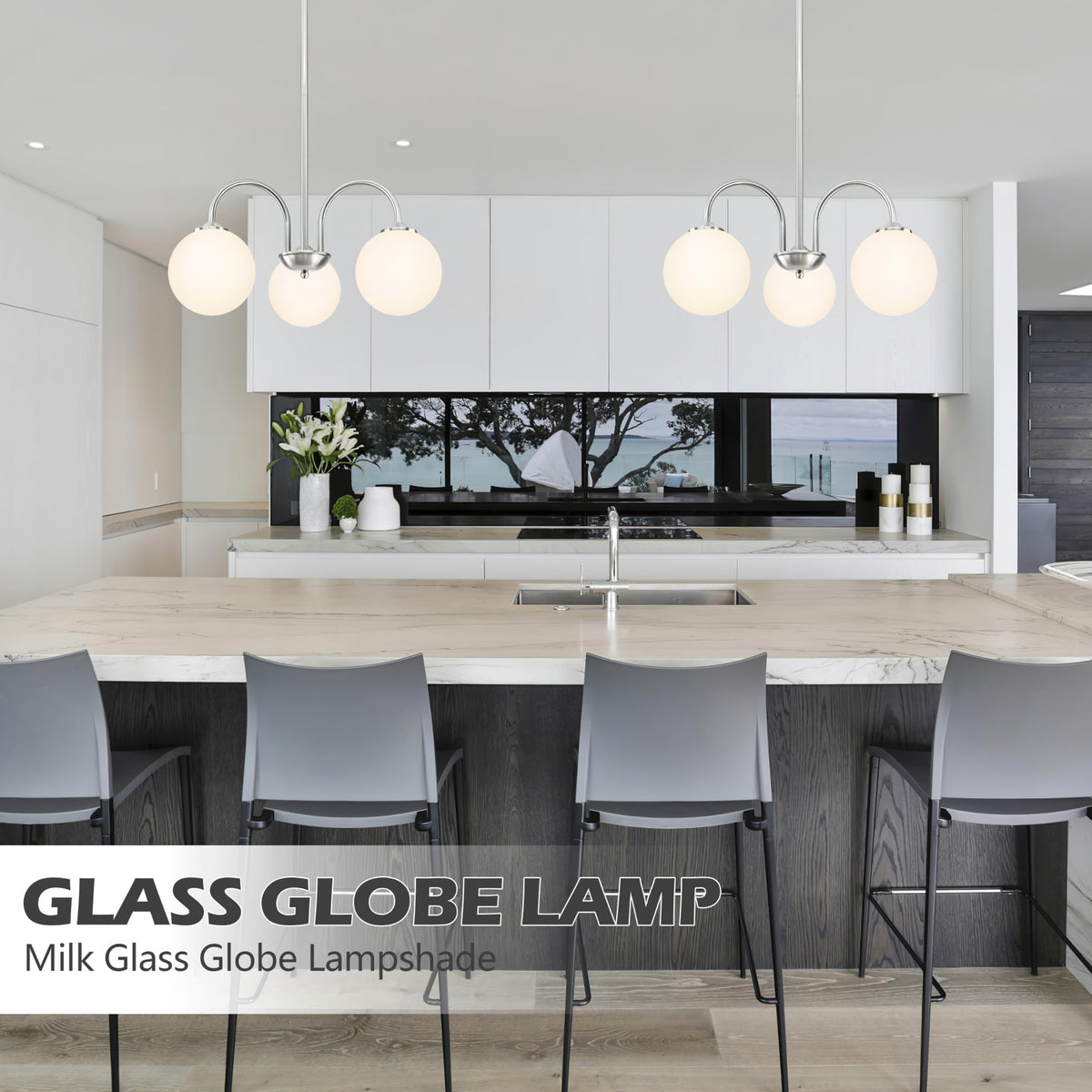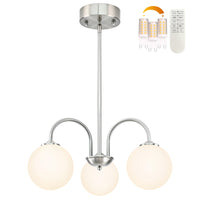 Bagood Nickel Globe Pendant Light 3 Lights Modern Sputnik Chandelier 19.6 Mid Century Modern Light Fixture with Milk Glass Globe Shade Dimmable Chandelier for Bedroom Kitchen (G9 Bulb & Remote Incl.)
