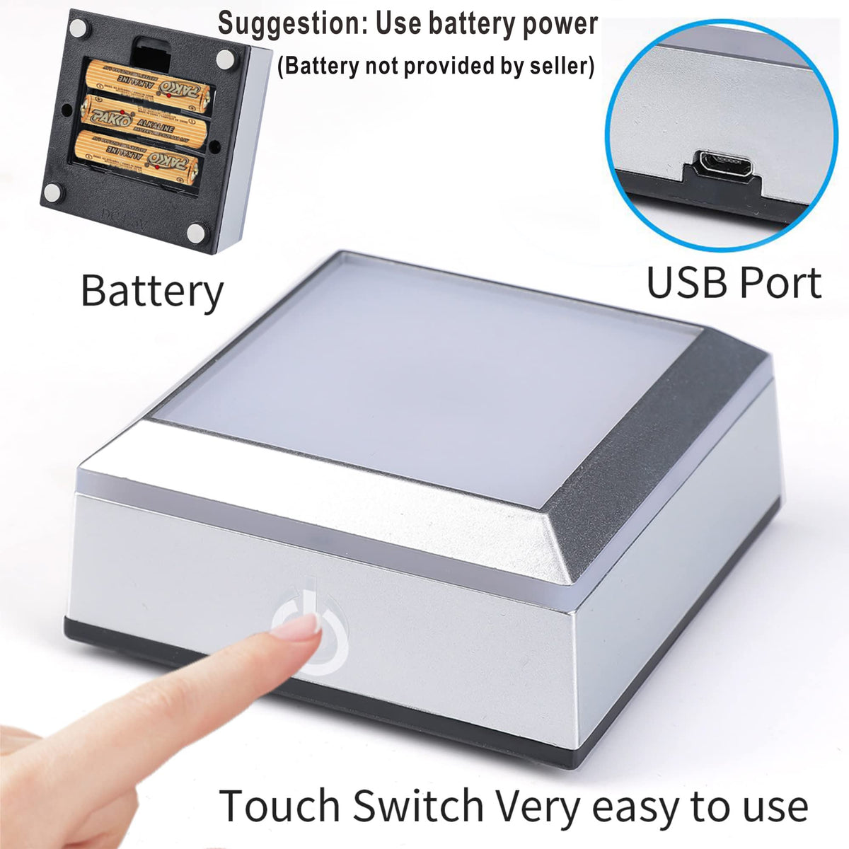 Q: How does the LED lighting base work and what are its features?A: The LED lighting base features six adjustable light modes, allowing you to change the colors and effects, including constant colors and blinking patterns. It is equipped with a tactile power switch for easy operation and can be powered by three AAA batteries, a USB connection, or an AC power supply.