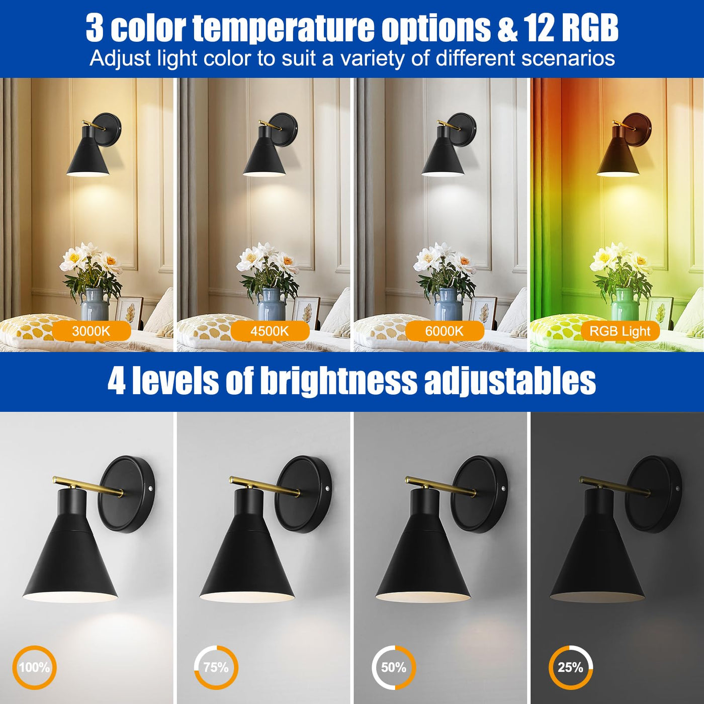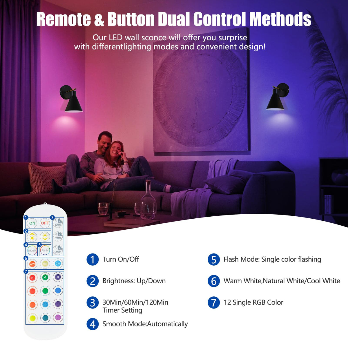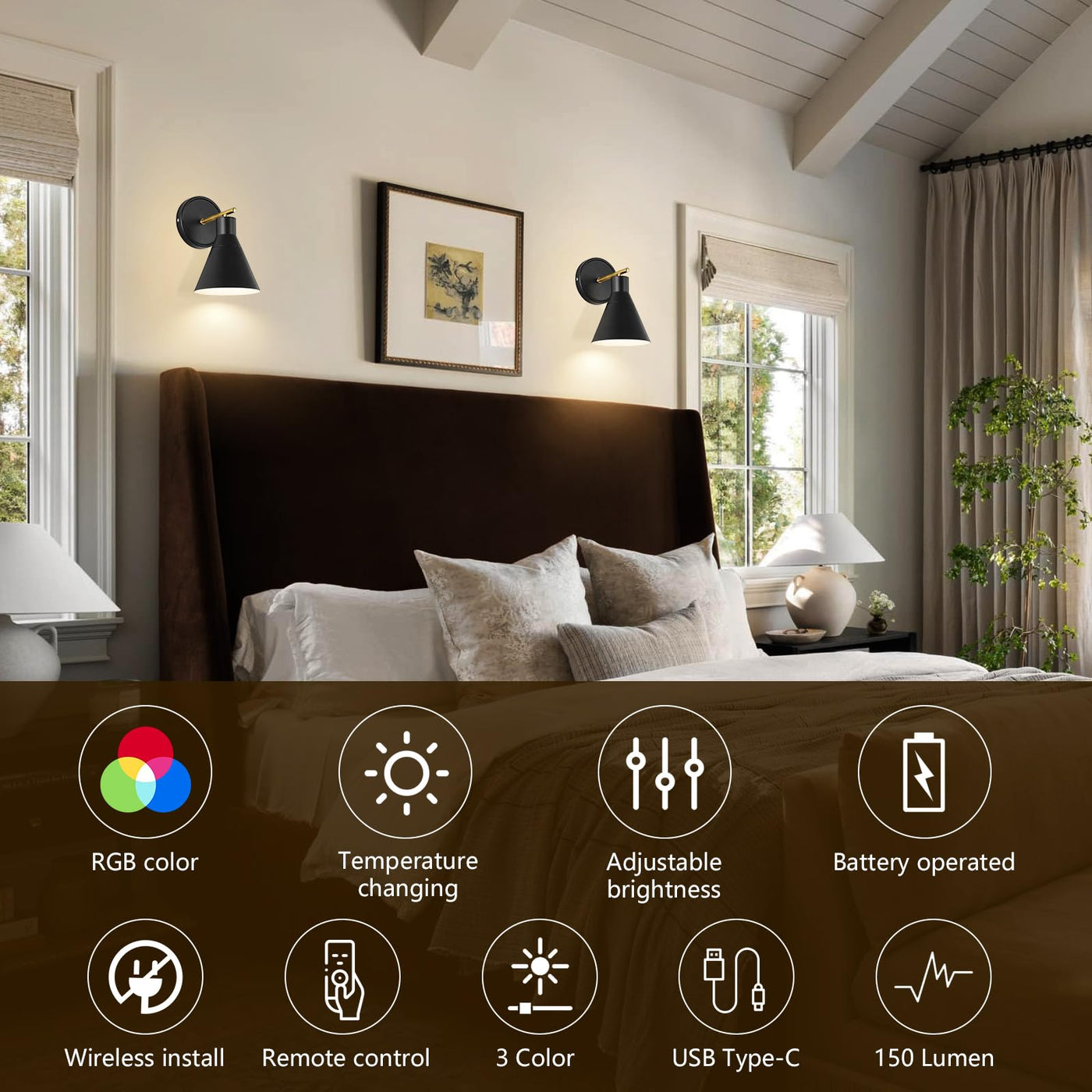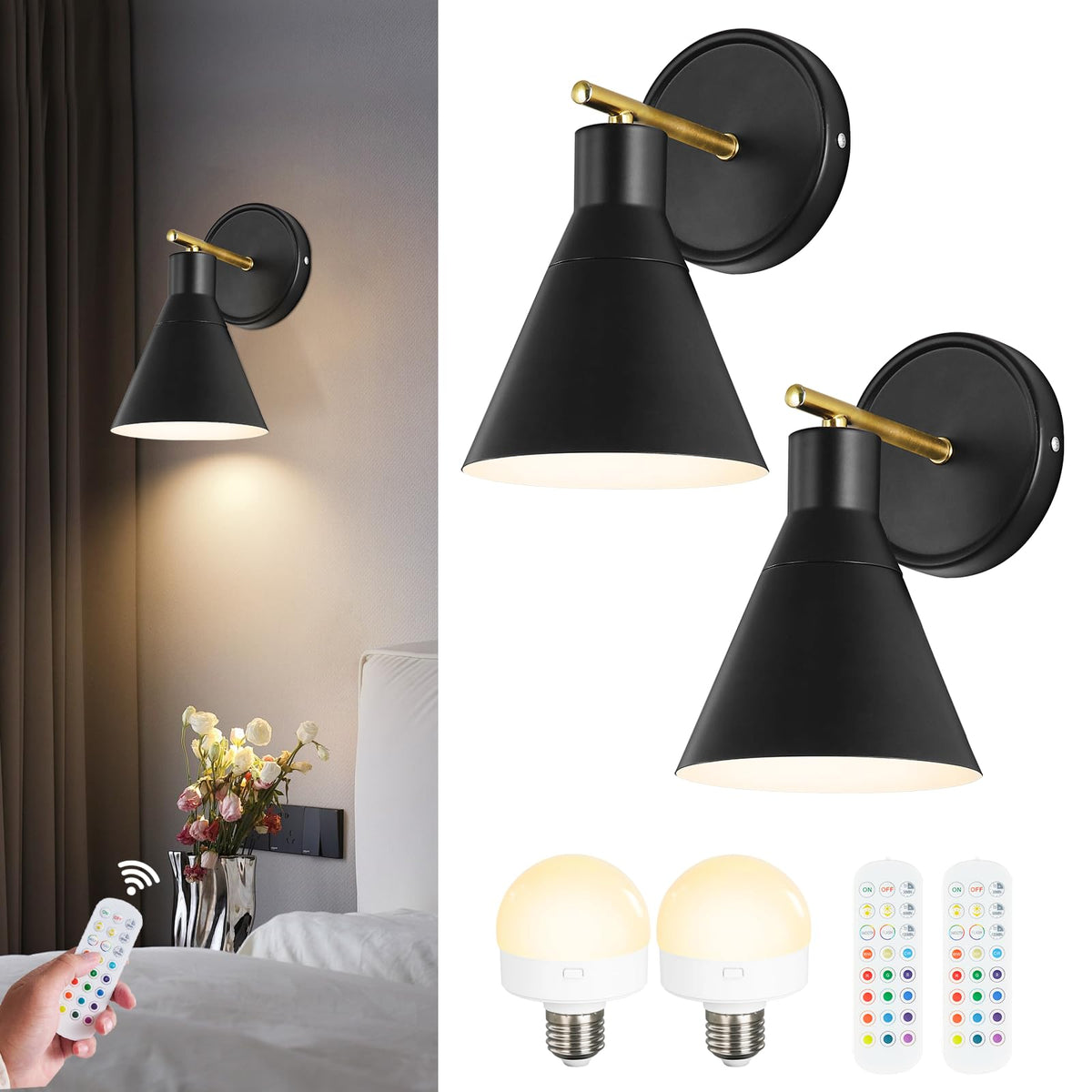 Bailoch Black Rechargeable Battery Operated Wall Sconces Set of 2 with Remote, Wireless Dimmable Battery Powered Wall Lights, 15 Color Wall Sconce X2 Light bulb X2 Remote X2 Instruction X1