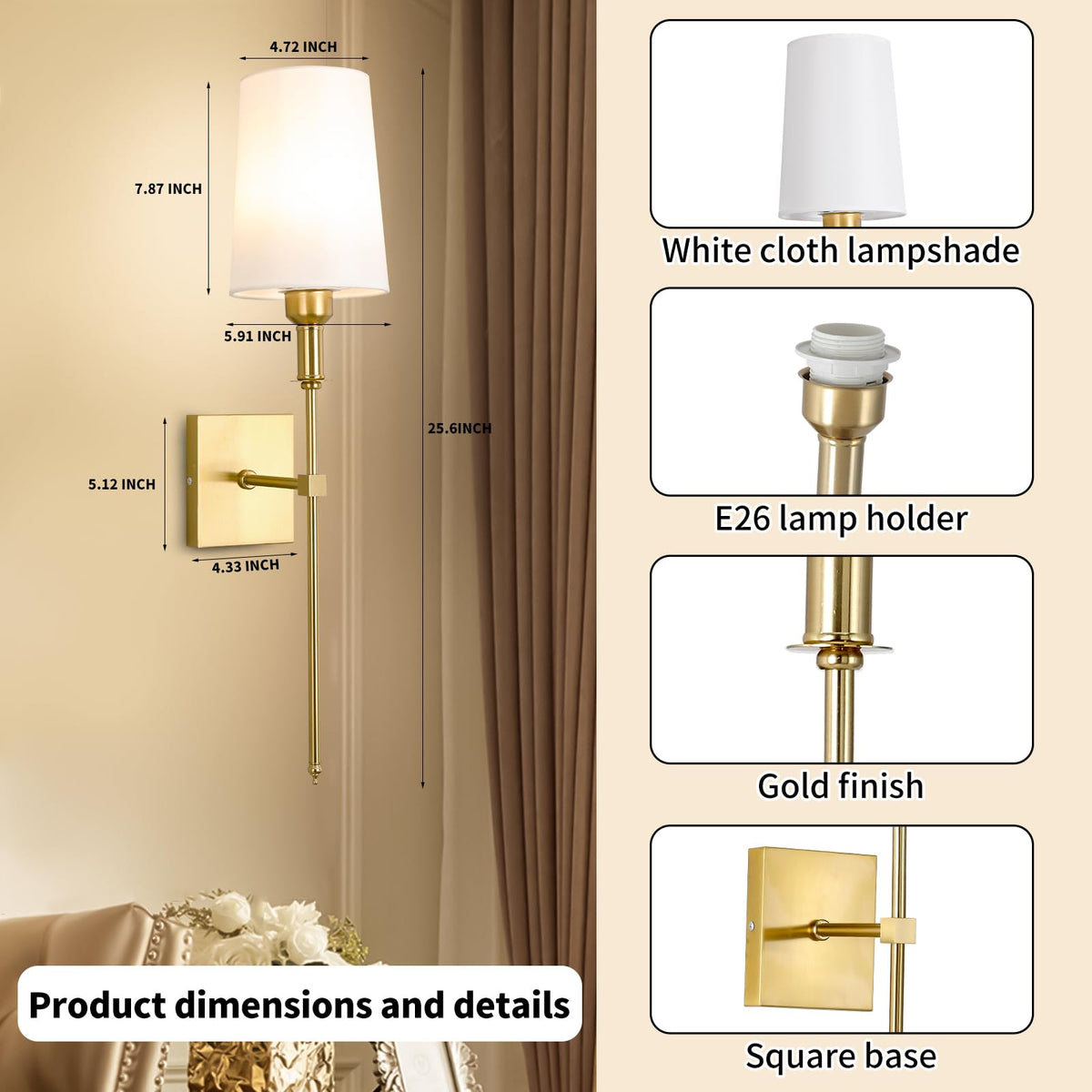 Q: What materials are these wall sconces made of?A: These sconces are crafted with a premium brass finish and feature a durable design, ensuring both aesthetic appeal and long-lasting durability suitable for various environments.