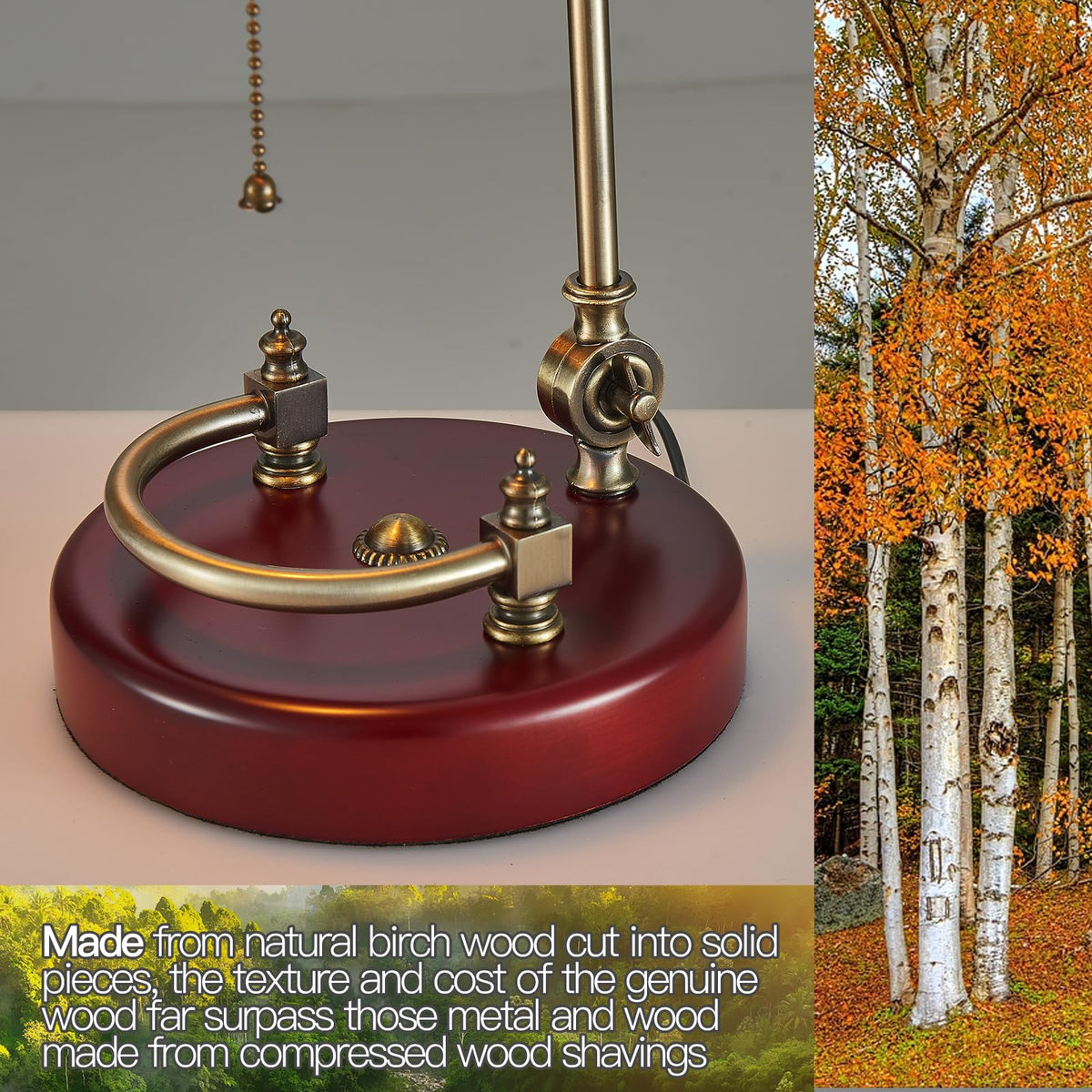 Bankers Lamp, Traditional Green Desk Lamp With Solid Birch Wood Base, Green Glass Antique Library Lamp With Pull Chain Switch, P