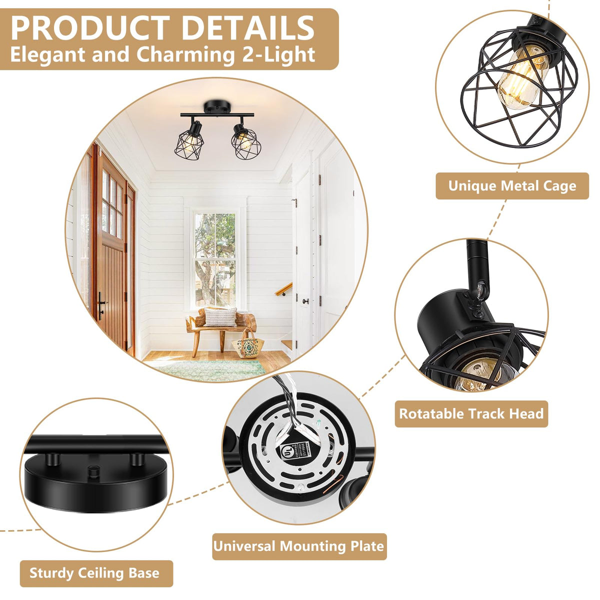 Baocuz 2-Lights Ceiling Light Fixtures, Adjustable Metal Wire Cage, Vintage Style, Black, Model BTCL-2 Light