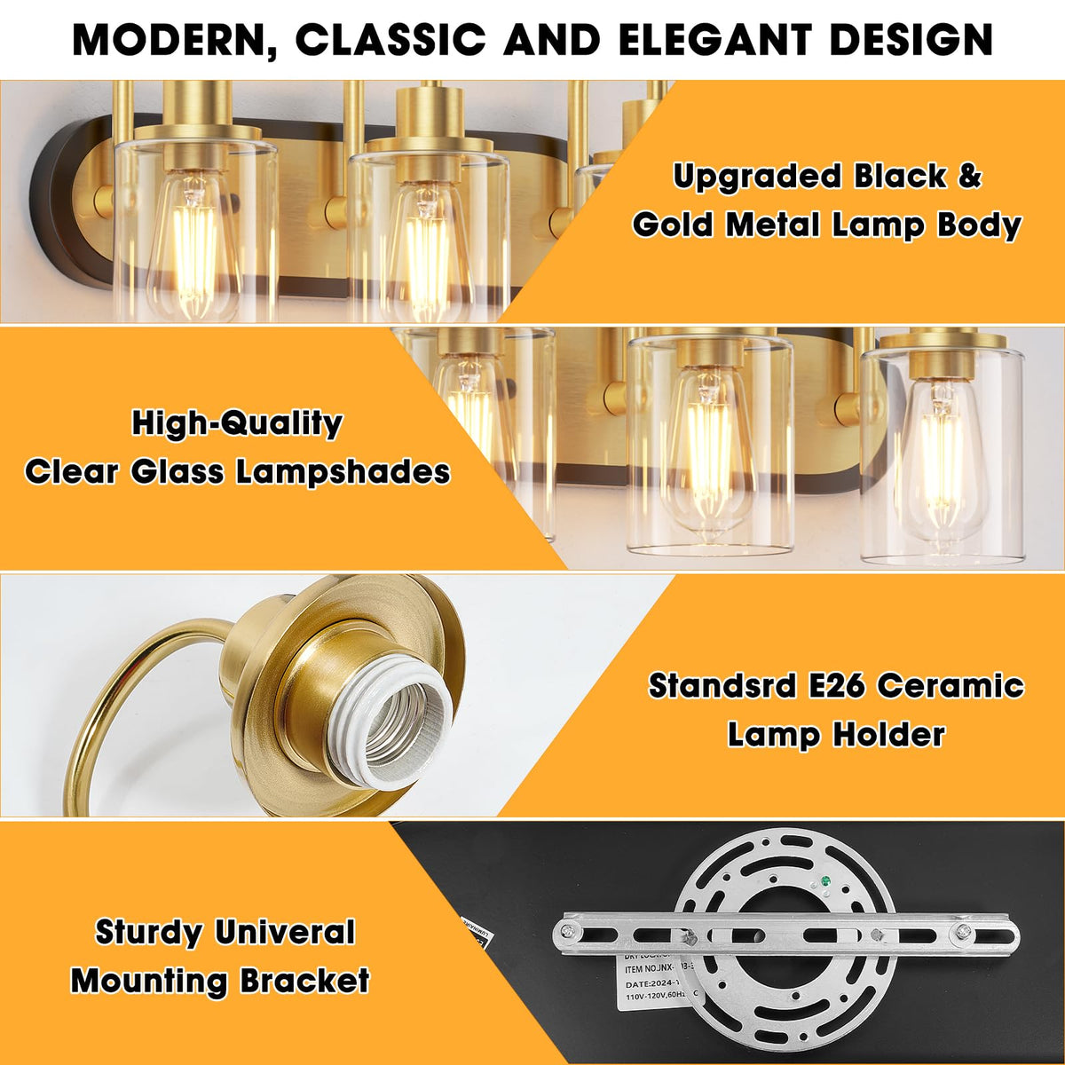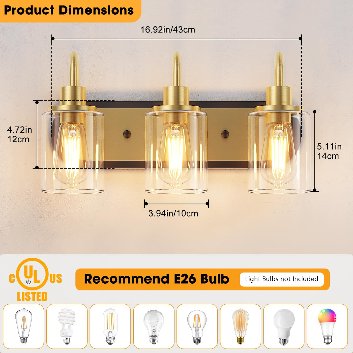 This 3-Light black and gold bathroom light fixture is the perfect addition to any modern home decoration! Unlike other traditional design, this bathroom wall sconces features an oval shaped backplate design. Crafted from sturdy metal lamp body with clear glass shades, they are ideal for adding a touch of style to your bathroom mirror, bedroom, living room, or dressing table. Good choices for home lighting!