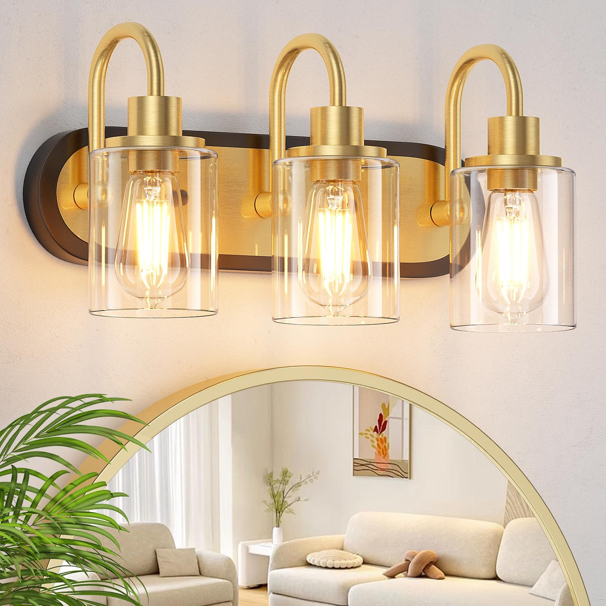Baocuz 3-Light Black And Gold Vanity Light, Mid Century Brushed Gold Bathroom Light Fixtures Over Mirror With Clear Glass Shade