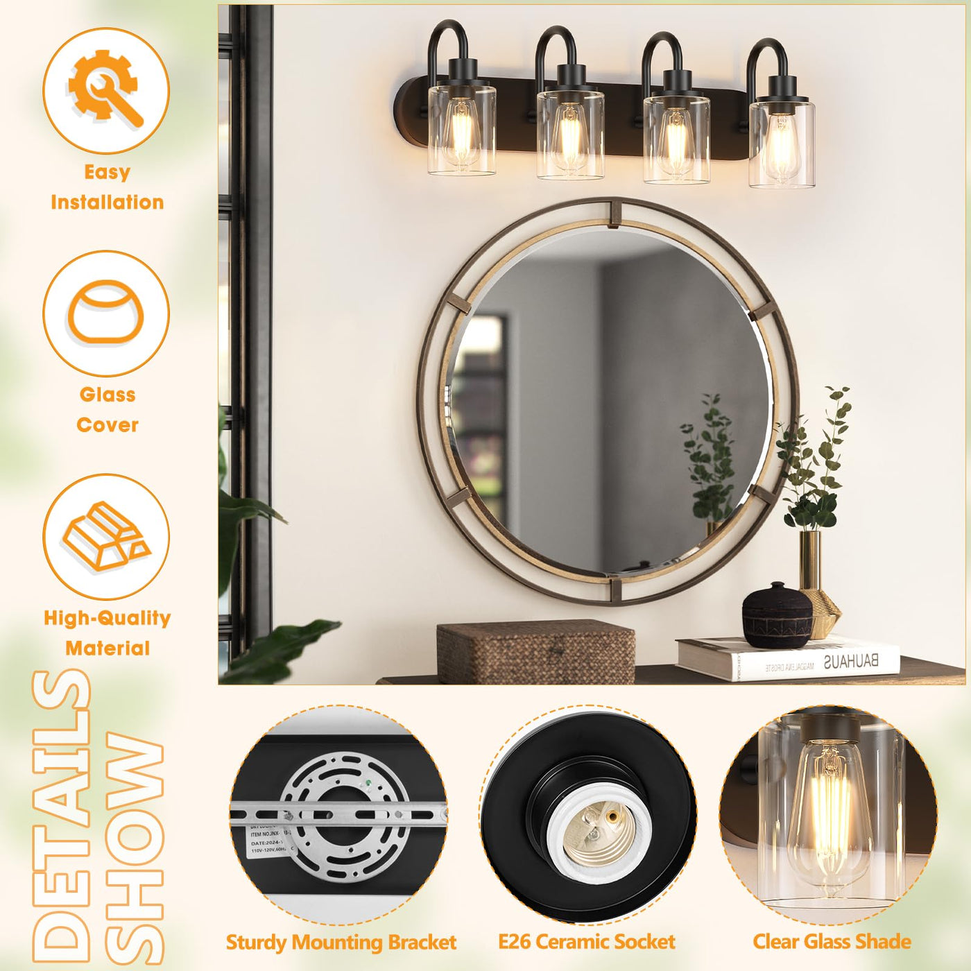 This 4-Light black bathroom vanity light is the perfect addition to any modern or farmhouse home decoration! Unlike other traditional design, this bathroom wall lighting features an oval shaped backplate design. Crafted from the matte black lamp body with clear glass shades, they are ideal for adding a touch of style to your bathroom mirror, bedroom, living room, or dressing table. Good choices for home decoration!