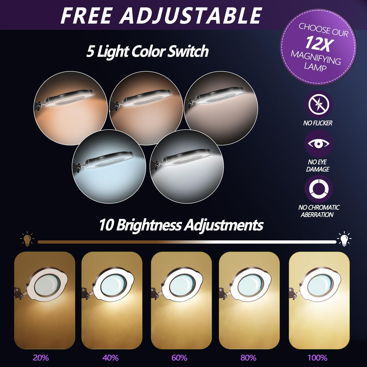 Baoomalongly 12X Magnifying Glass Lamp, Adjustable Swing Arm 72 Leds Real Glass Lens Magnifier Light,5 Color Modes 10 Stepless D
