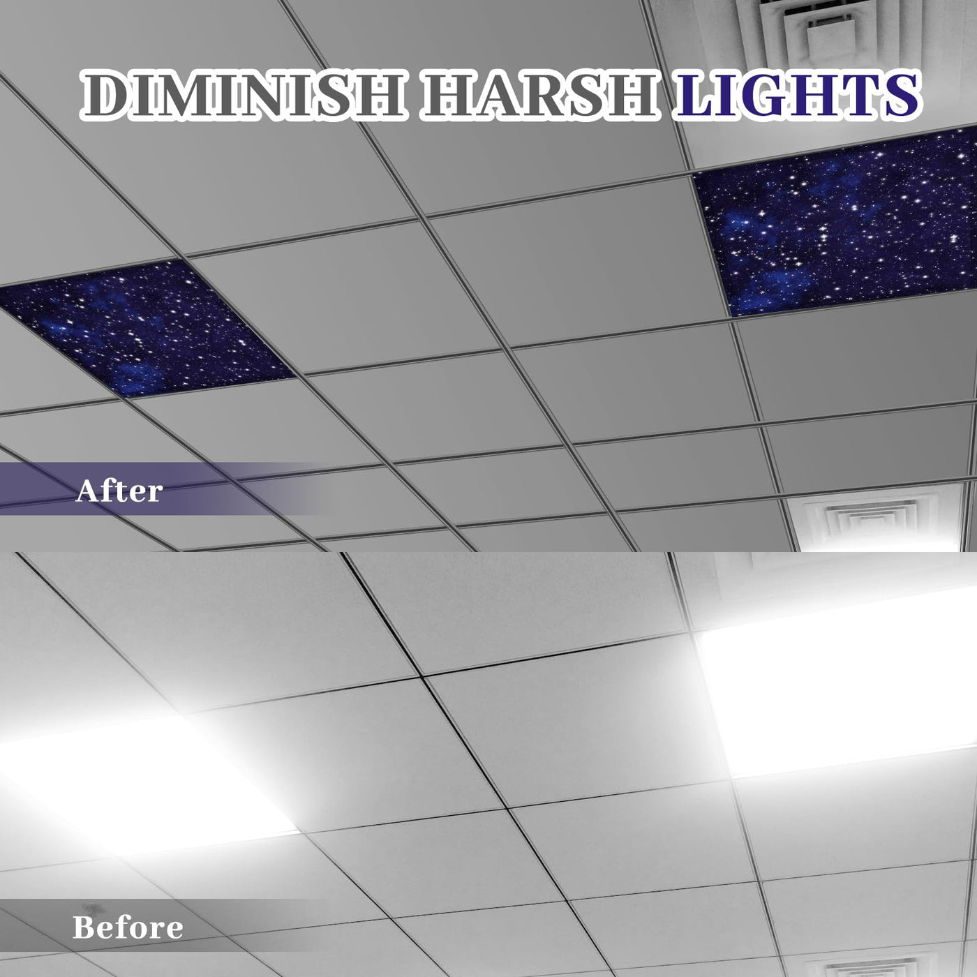 Constructed from well-made flame retardant fabric, these ceiling light covers not only improve the aesthetic appeal of your lighting but also add an extra layer of safety to your environment. The covers feature a beautiful starry sky pattern that diffuses bright light, creating a serene atmosphere conducive to relaxation and concentration. With an approximate size of 2 x 2 ft, they are versatile enough to fit most standard fluorescent light fixtures.