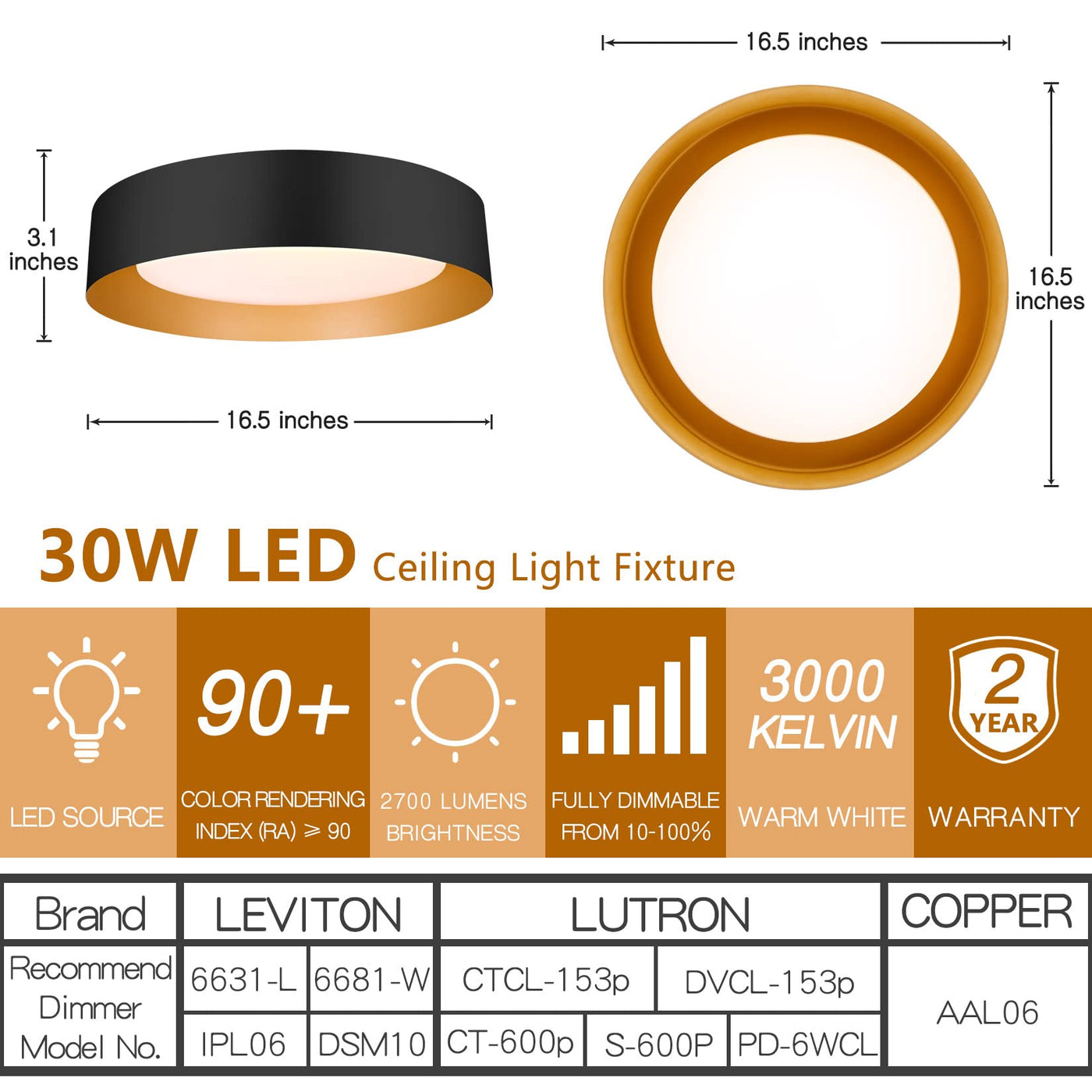 Bargeni 16.5 Inch Led Ceiling Light Fixture,Dimmable Flush Mount Ceiling Light Matte Black With Gold Inside,3000K/Warm White/30W