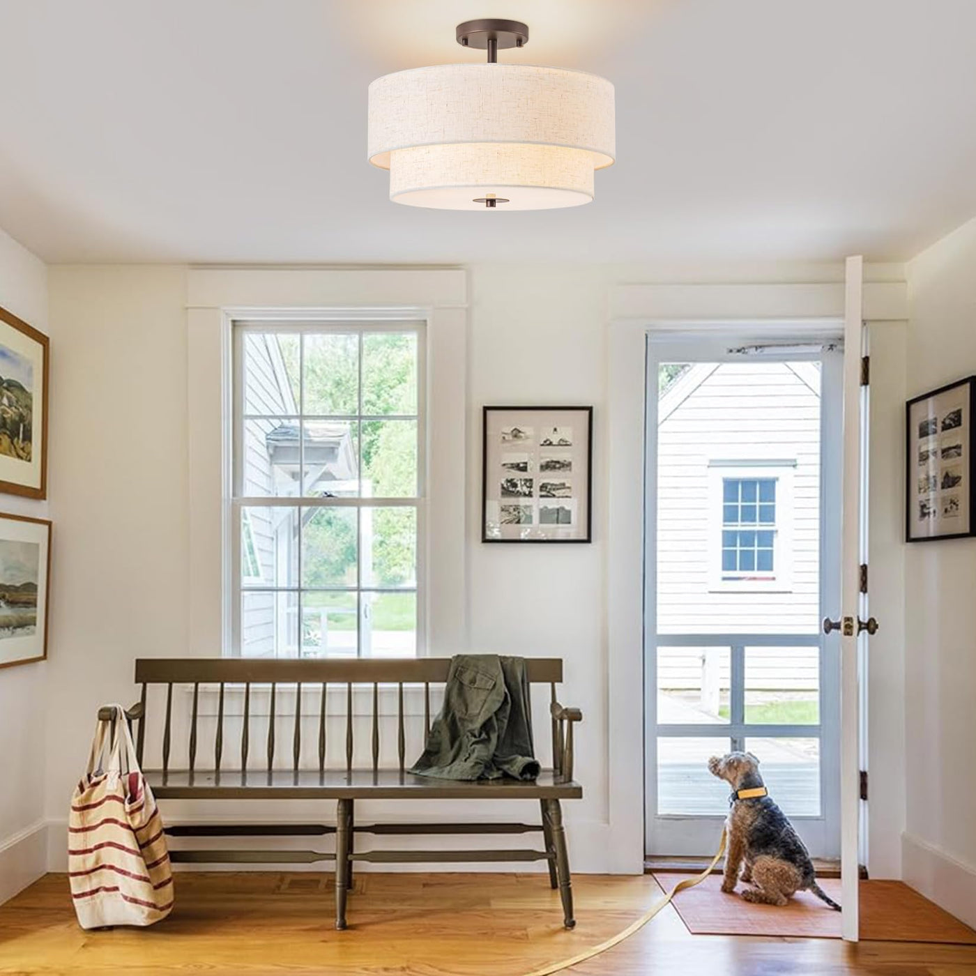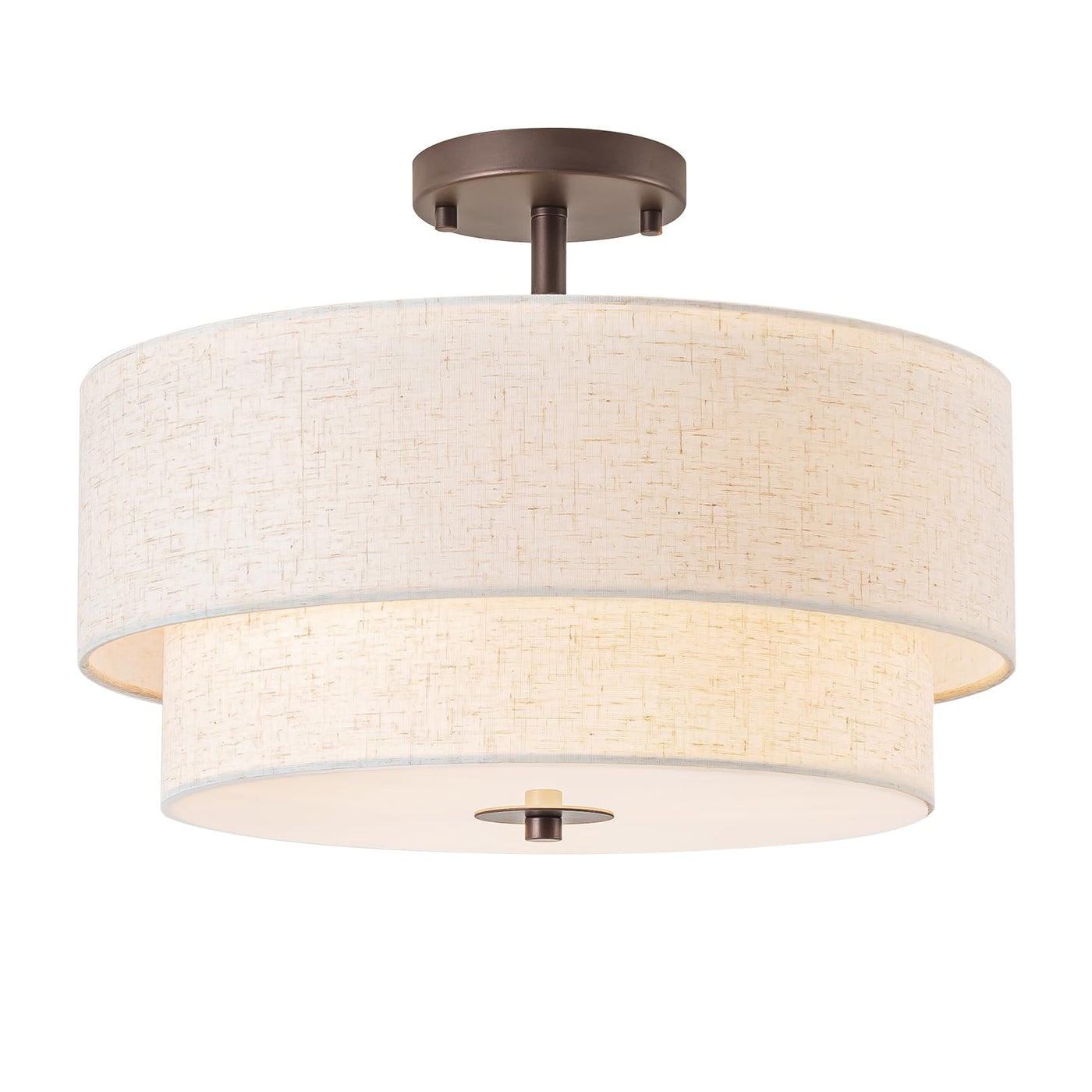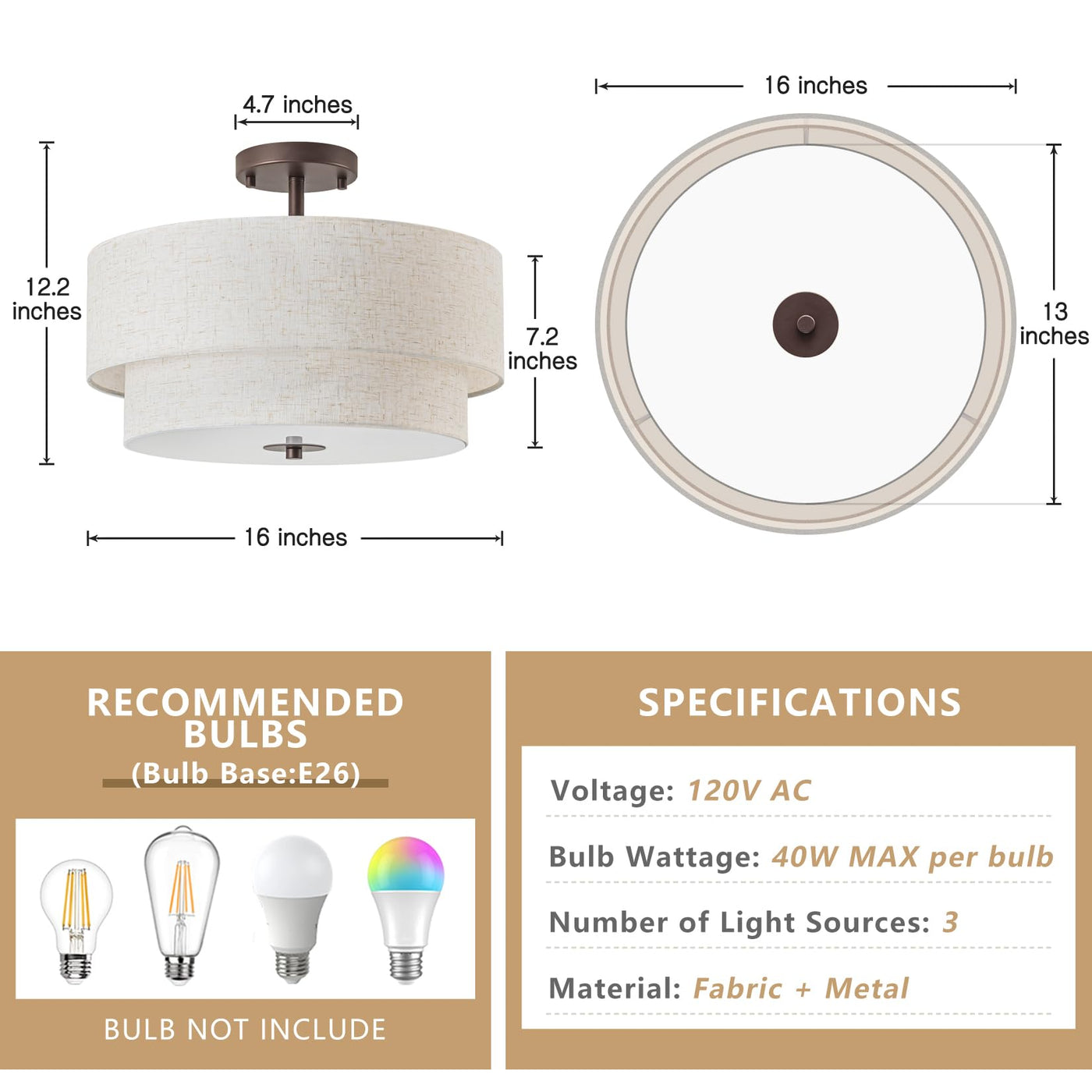 Bargeni 16'' Semi Flush Mount Ceiling Light, 3-Light Drum Ceiling Light Fixture, Oil Rubbed Bronze With Double Linen Fabric Shad