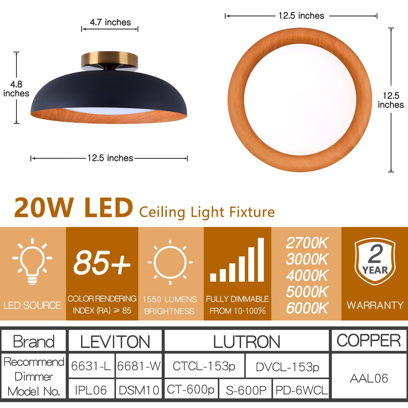 Bargeni Flush Mount Ceiling Light,12.5 Inch Led Ceiling Light Fixture,5Cct Dimmable/2700K-6000K/20W, Matte Black With Wood Accent,Mid Century Light Fixtures Ceiling Mount,Etl Certified
