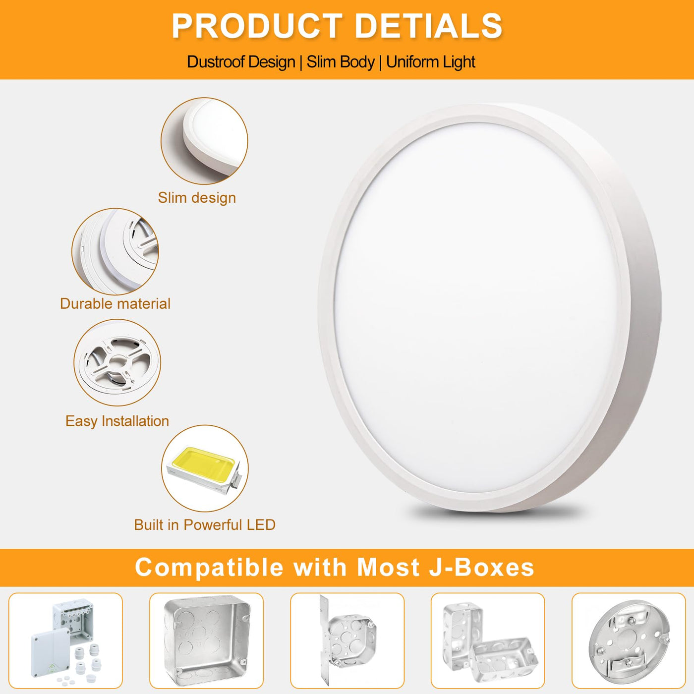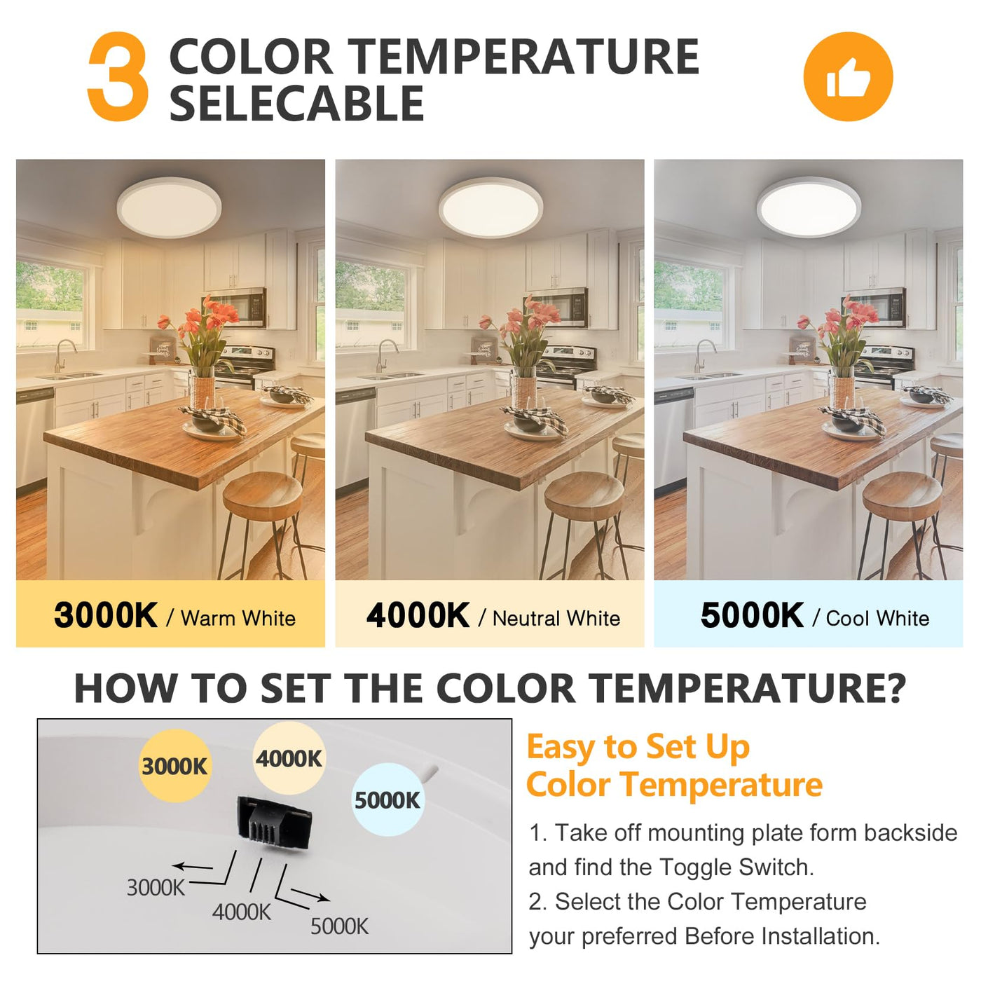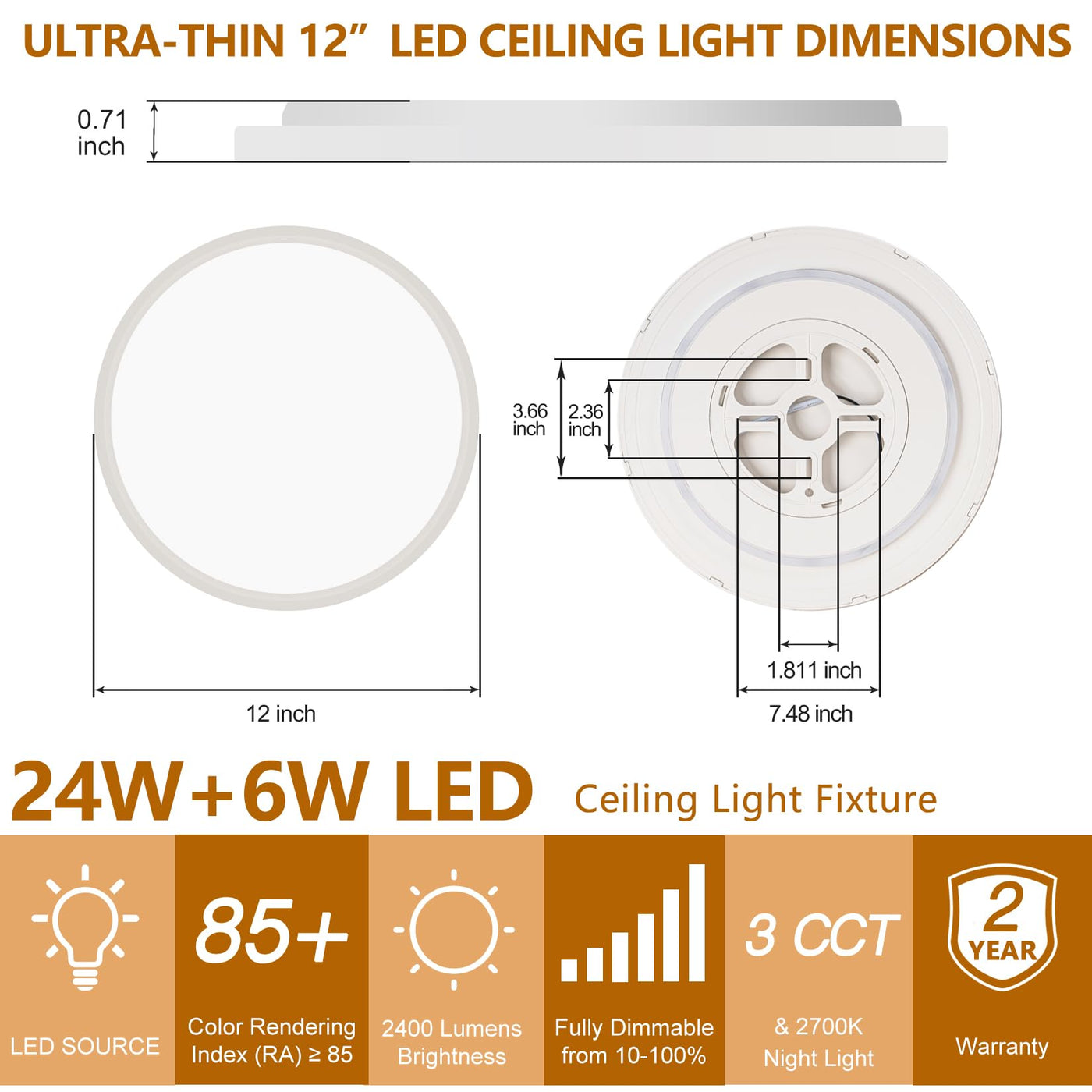 Bargeni Flush Mount Ceiling Light,12 Inch Led Ceiling Light Fixture With Night Light,24W/3000K/4000K/5000K Dimmable,Light Fixtures Ceiling Mount,Low Profile Ceiling Light,White