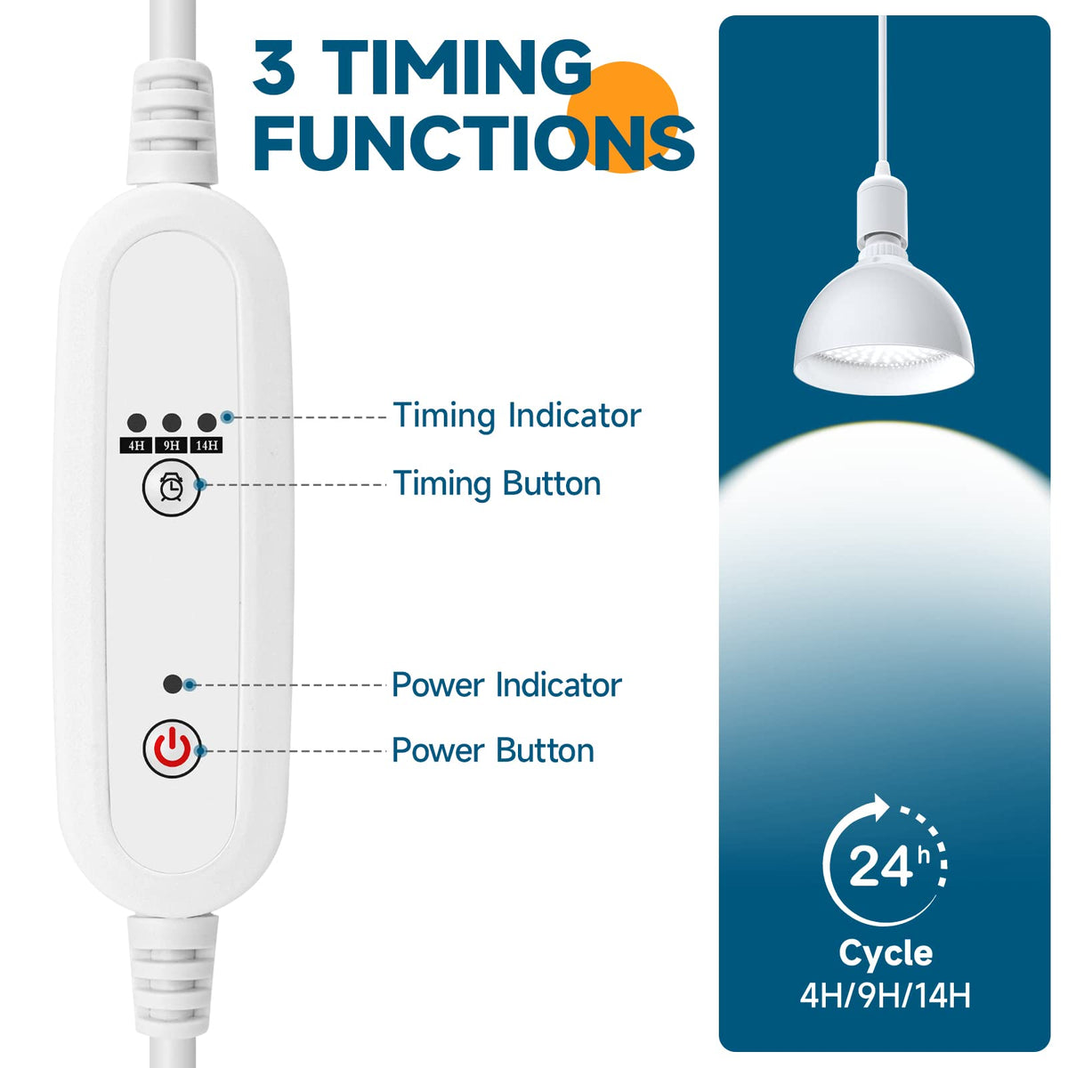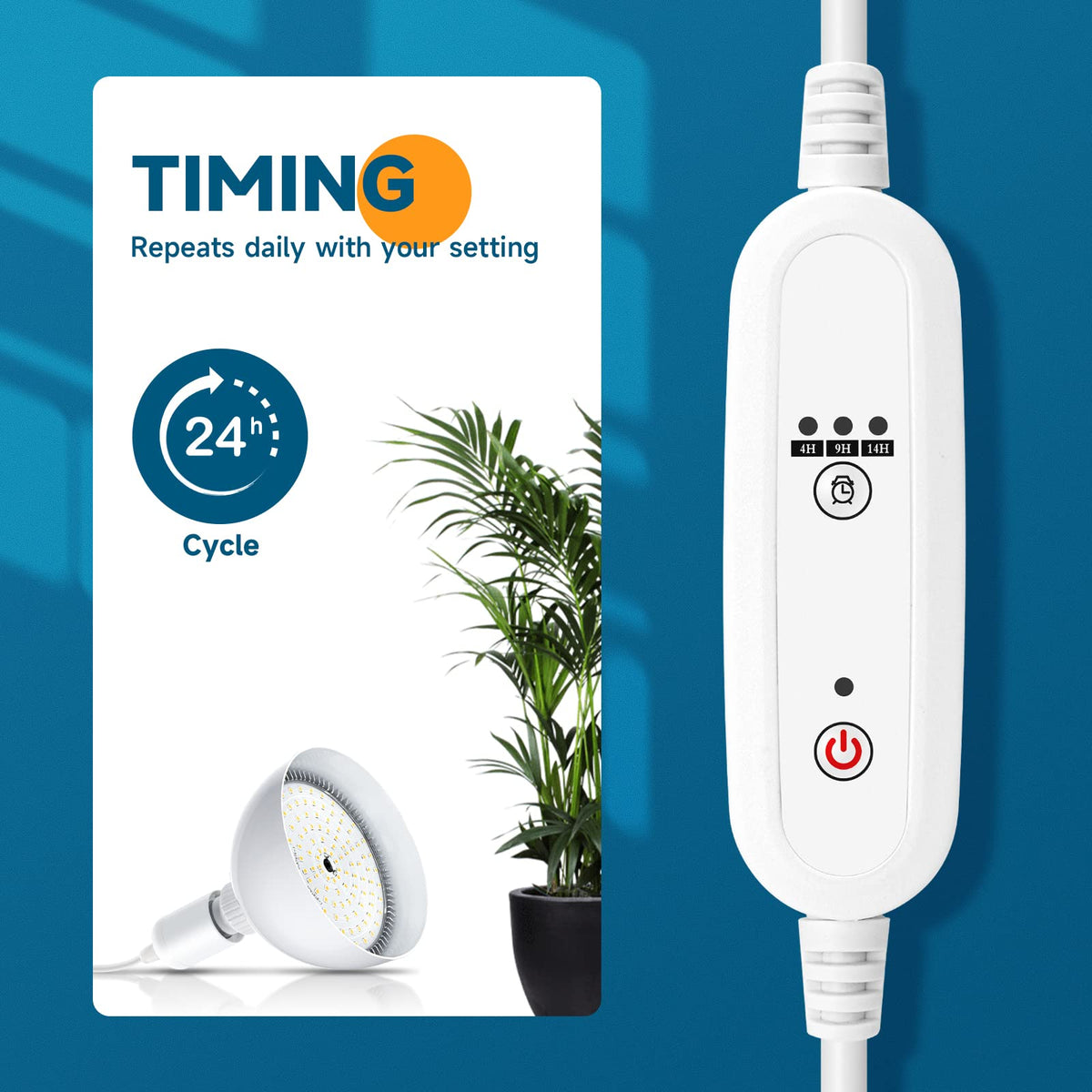 Q: How does the timer function work on this grow light?A: The grow light features a timer with three settings: 4 hours, 9 hours, and 14 hours. You can set it to repeat daily, providing convenient automated lighting for your indoor plants.
