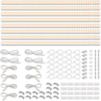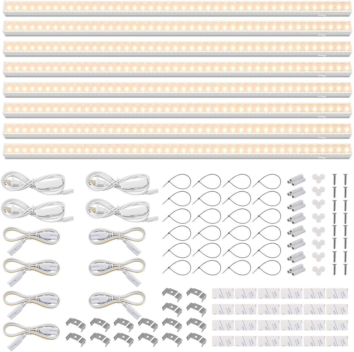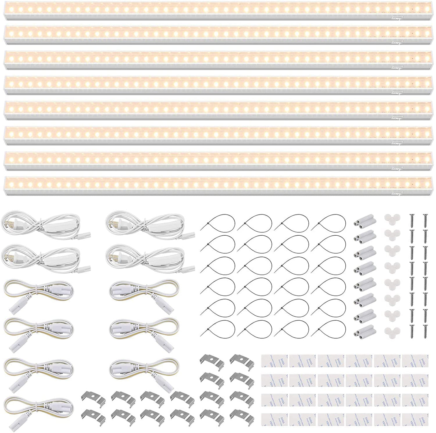 - **Comprehensive Package:** This set includes 8 Barrina T5 Grow Lights, 4 power cords with ON/OFF switches, 7 connecting cords (20 inches), 8 small connectors, 16 installation clips, 24 double-sided tapes, and 24 cable ties, providing everything you need for a complete setup.