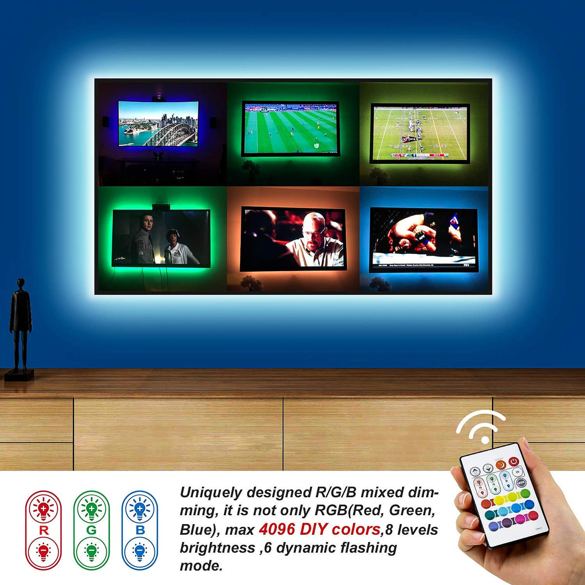 Q: How many colors and brightness levels does the remote control offer?A: The included remote control features 4096 DIY colors and 16 levels of brightness, allowing you to customize the ambient light to suit your mood and reduce eye strain during viewing.