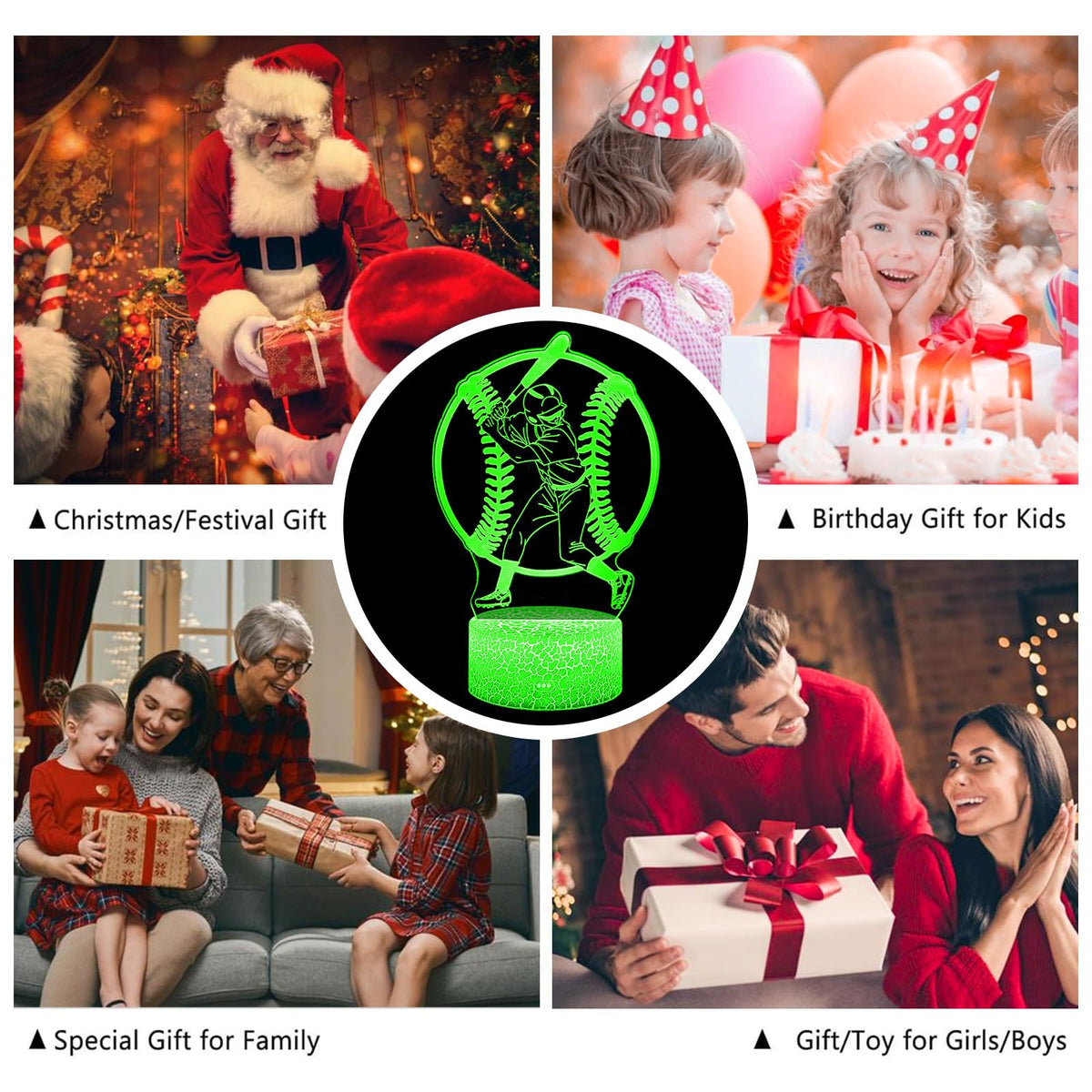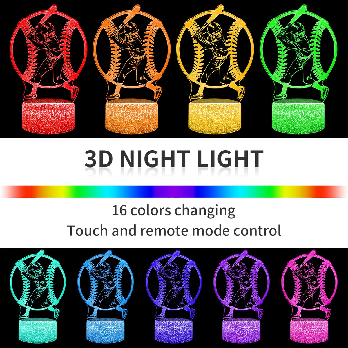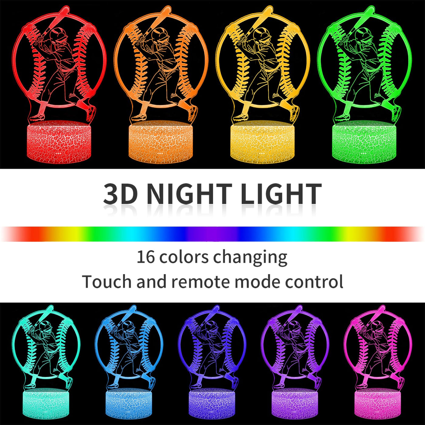 Bassi Baseball Gift 3D Night Light For Kids - 16 Colors & Flashing Modes With Remote Control Opreated Dimmable - Baseball Player Decor - Christmas Birthday Gifts For Boys Girls Sport Fans