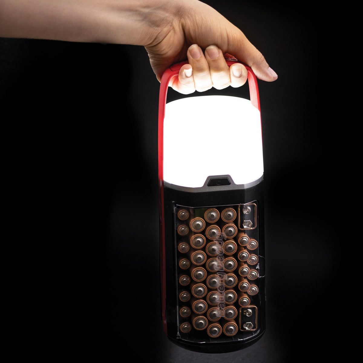 Battery Daddy Lantern 2-in-1 Ultra-Bright Utility Light and Battery Storage System Battery Daddy Lantern is a 2-in-1 ultra-bright utility light and battery storage system. The LED utility light offers 1,000 Lumens of bright white light and runs on 3 AA batteries (batteries not included). Choose from three adjustable light settings: low, high and strobe. Battery Daddy Lantern stores and organizes up to 42 batteries: 23 AA, 17 AAA, and 2 9-volt and helps keep each battery safe and secure in a customized slot. Batteries not included. The clear easy view cover is designed to allow you to see all your batteries at once. The secure, heavy-duty latches helps make sure your batteries stay in place. The compact design is intended for Battery Daddy Lantern to fit in many cabinets, drawers, or shelves. Best of all, Battery Daddy Lantern comes with a screwdriver and a built-in battery tester so you can test the life of the batteries you have. Keep Battery Daddy Lantern on hand at home, for power outages, emergencies, roadside assistance, camping, workshops and more!