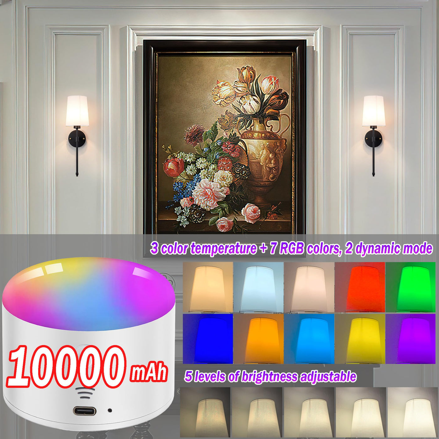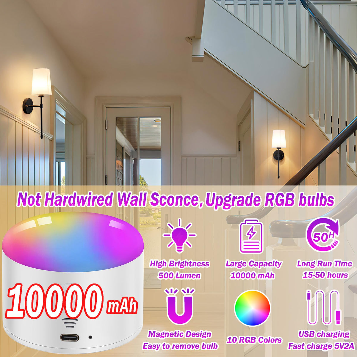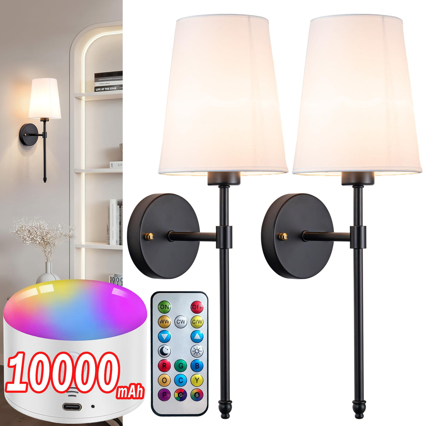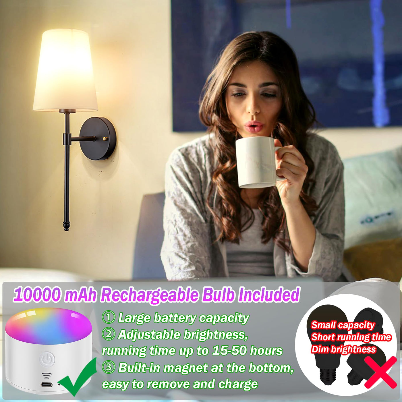 2 Pack Battery Operated Wall Sconce Modern Wall Light Fixtures Indoor Fabric Shade Wall Sconce Not Hardwired Wall Mounted Light for bedroom, living room, bedside, hallway, porch, corridor, entryway, front door and other space as you need.Features:1. Easy to install, no wiring, no need to plug in. 2. The brightness of the battery operated wall sconce with remote control is 300-500 lumens. 3 color temperatures (3000K warm light, 4500K warm white light, 6000K white light) can be switched at will.3. Use a remote control to turn on/off the battery wall lamp up to 16 feet. 3 levels of brightness are adjustable, and the use time is long (High>12h, Mid>18h, Low>30h).4. Led light bulb built-in lithium battery, rechargeable, free USB charging cable.Package Included:2 x modern wall lamp 2 x rechargeable light bulbs and remote (includes USB charging cable)Kindly Note:1. Only use built-in lithum battery, pls do not replace inappropriate battery, it will cause led light damage.2. Before connecting with mains power, pls make sure switch is off. Do not touch the light body after connecting with power, to qvoide the electric shock.3. Please allow 1-2cm error due to manual measurement. pls make sure you do not mind before you bid.4. Due to the difference between different monitors, the picture may not reflect the actual color of the item. Thank you!