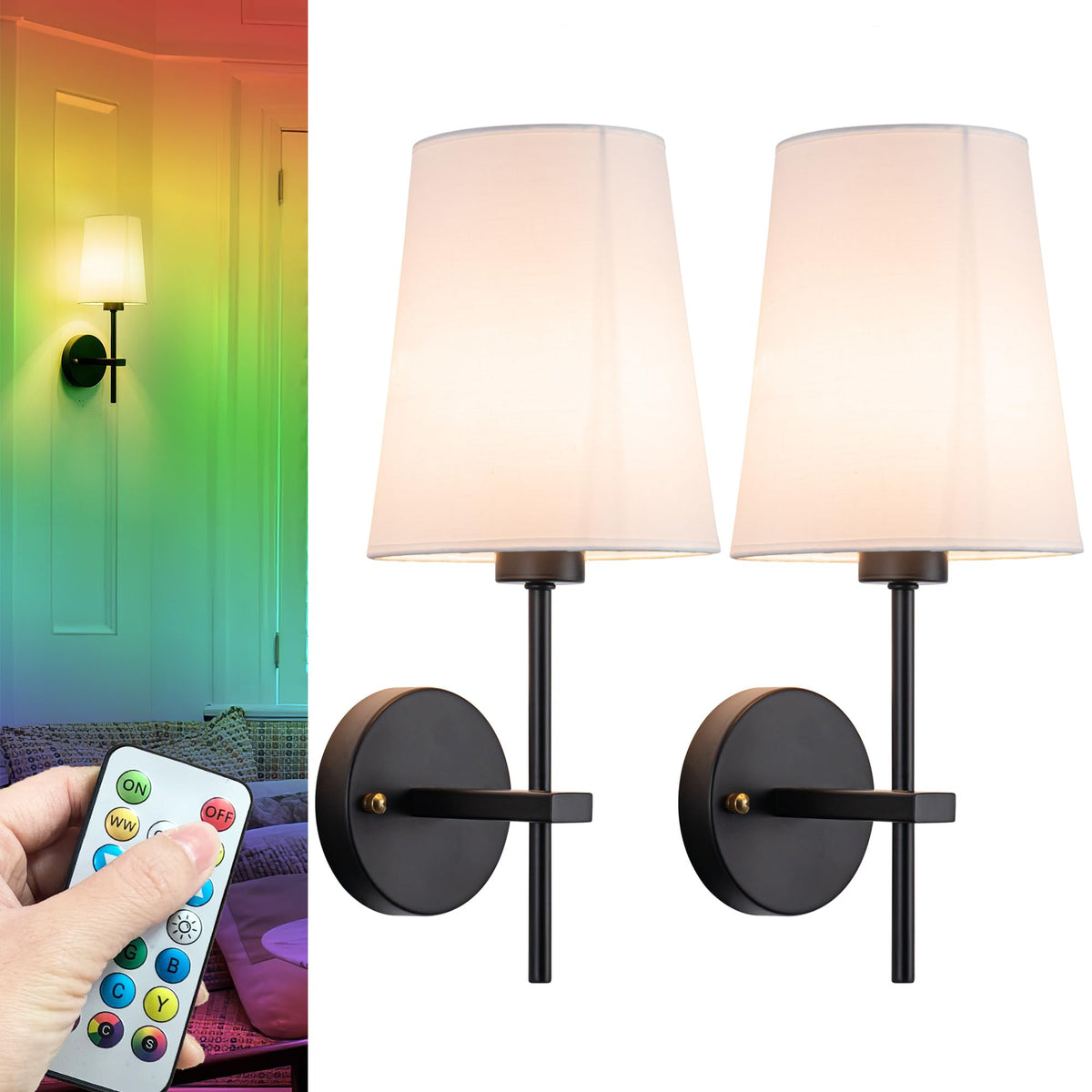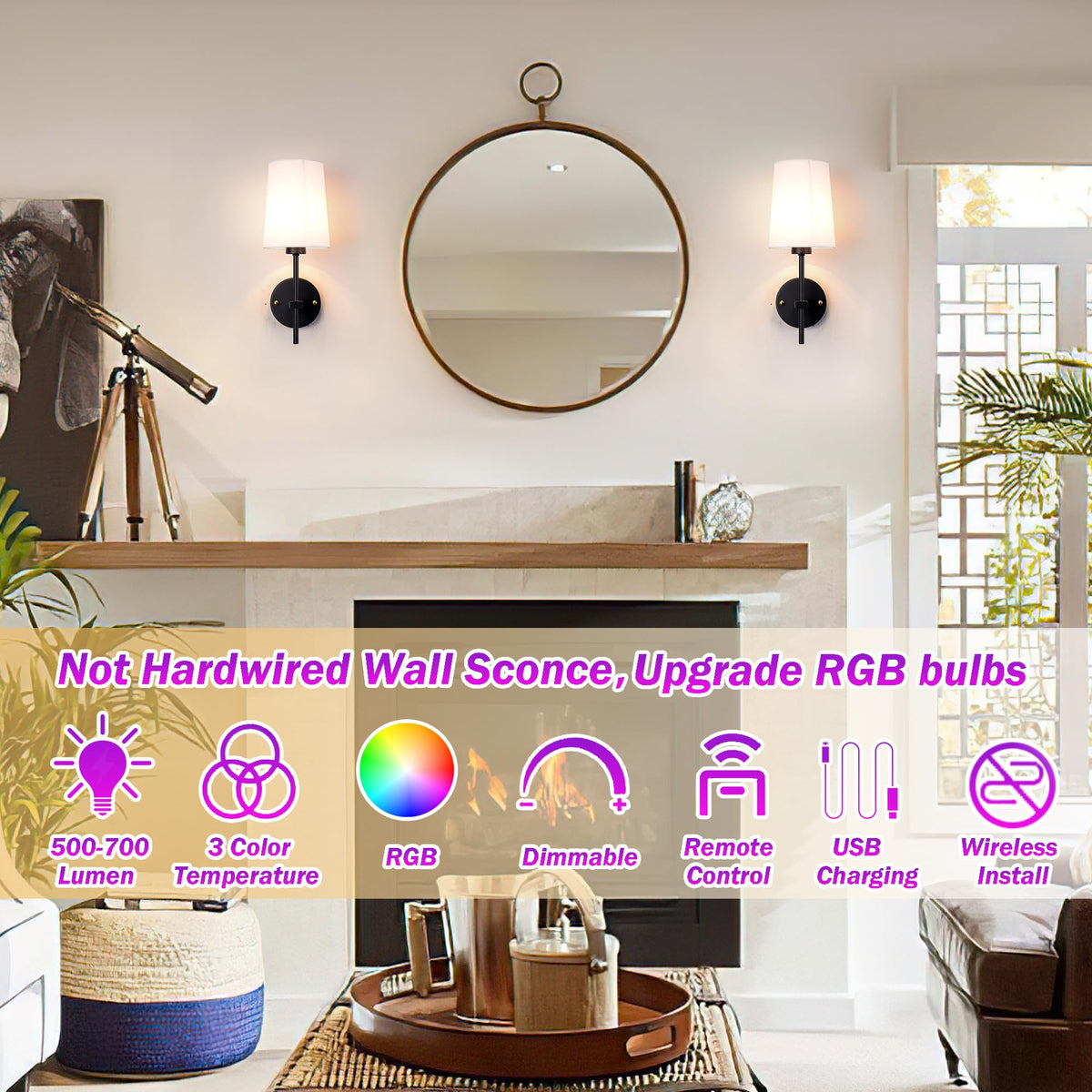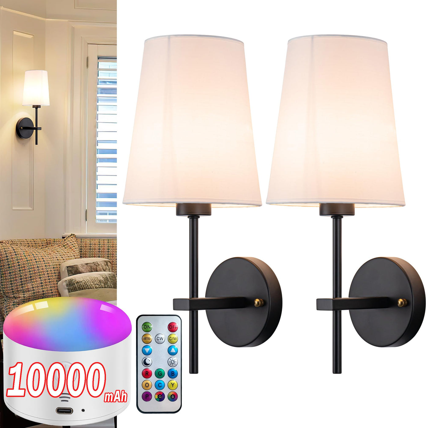 Battery Operated Wall Sconce Set Of 2, Wireless Dimmable Battery Powered Wall Lamp With Remote Control,Battery Wall Light With White Fabric Shade For Bedroom,Easy To Install,3 Color Temp Bulb Included