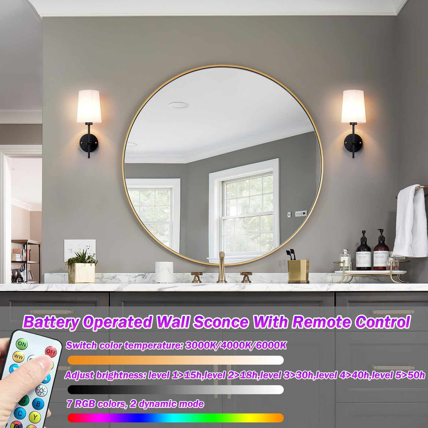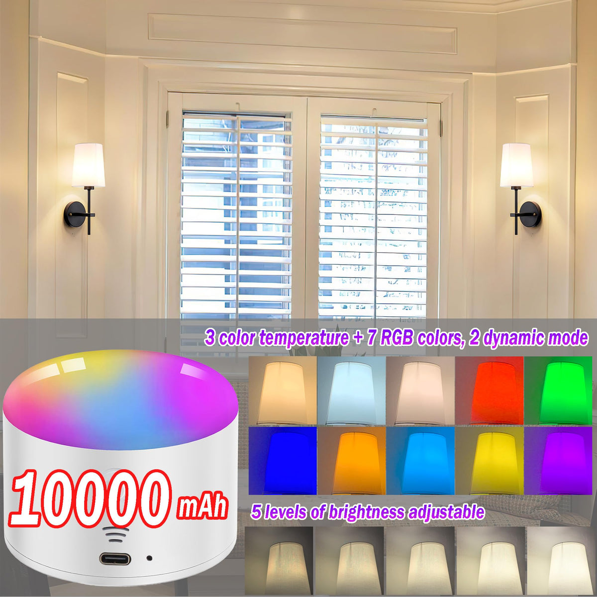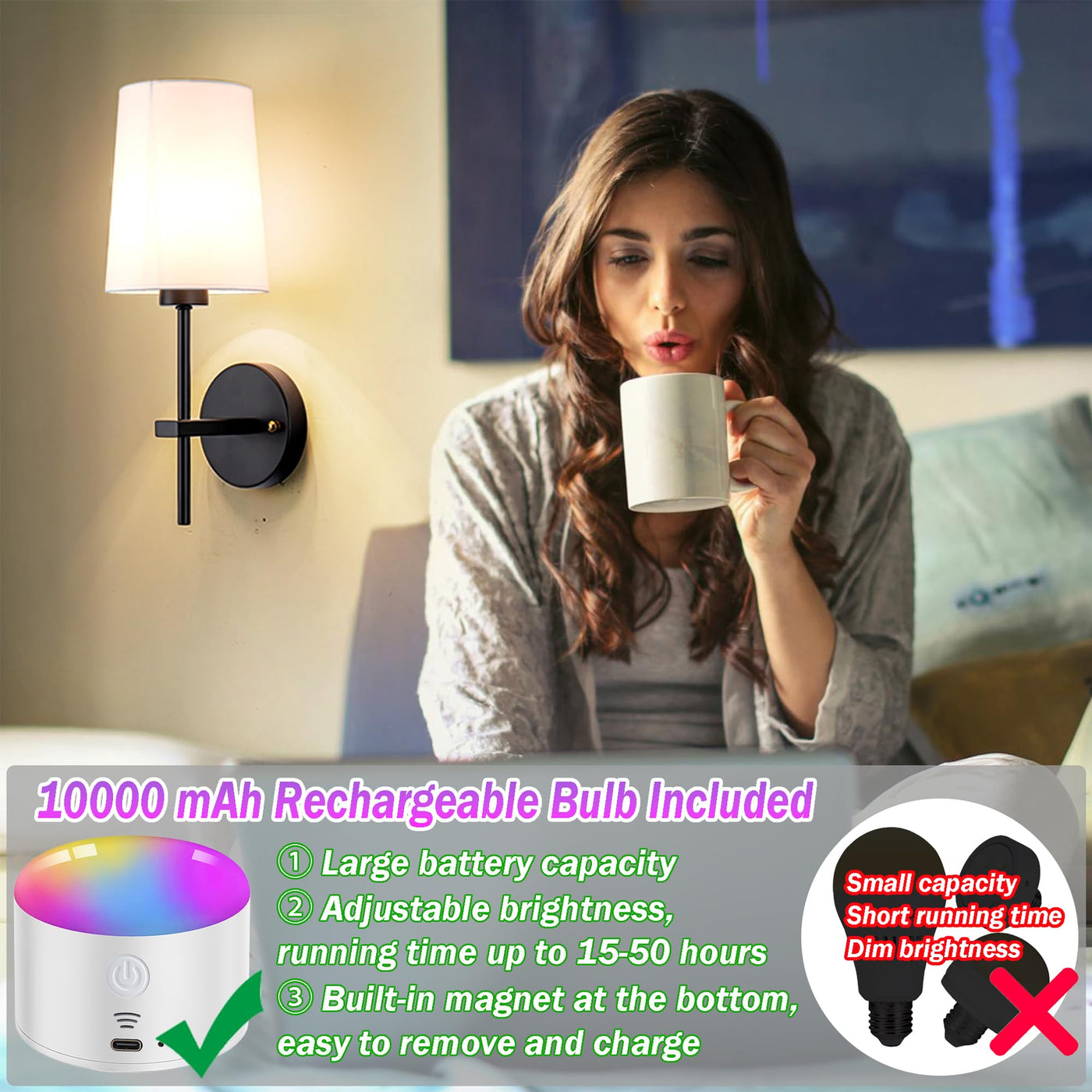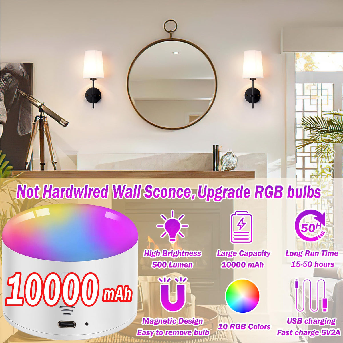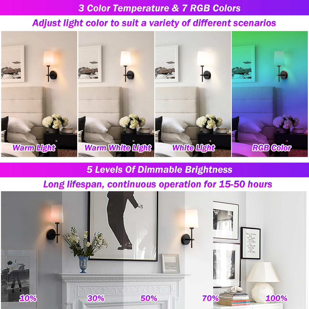 Features: 1. Easy to install, no wiring, no need to plug in. 2. The brightness of the battery operated wall sconce with remote control is 300-500 lumens. 3 color temperatures (3000K warm light, 4500K warm white light, 6000K white light) can be switched at will. 3. Use a remote control to turn on/off the battery wall lamp up to 16 feet. 3 levels of brightness are adjustable, and the use time is long (High>12h, Mid>18h, Low>30h). 4. Led light bulb built-in lithium battery, rechargeable, free USB charging cable.