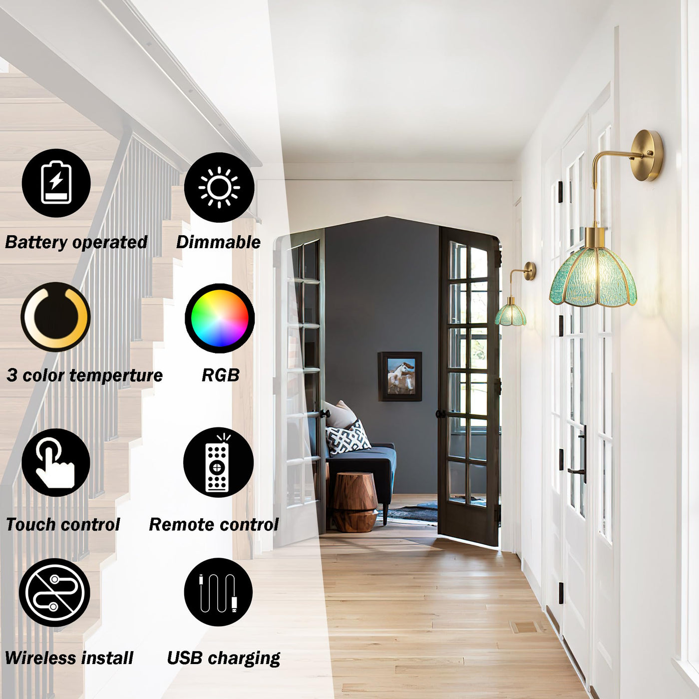 Features: 1. Choosing our USB rechargeable wireless sconces battery operated, you can add new lighting points anywhere. No need to wire, just hang the light wherever you want to unleash your decorating creativity. 2. The bulb built-in batteries and rechargeable,USB charging 7-10 hours full charged,over 35 hours of continuous use. 3. You can use the remote control to set the brightness to 50% (35H continuous work) , 75% (18H continuous work), 100% ( 12H continuous work),Use the direct dimmer button also can manually control the brightness and color of the light.