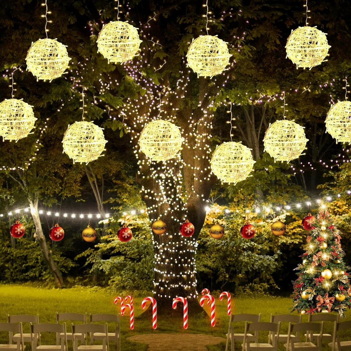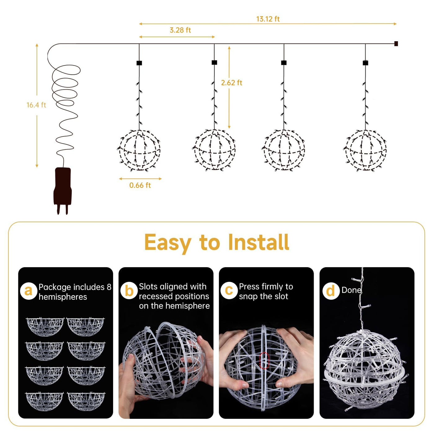 ?Outdoor Globe Lights with 8 Vibrant Modes? These hanging globe lights offer 8 distinct lighting modes - combination, wave, sequential, slow glow, chasing/flash, slow fade, twinkle/flash, and steady on. They are the perfect addition to elevate your garden, bistro, balcony, wedding, birthday celebration, Christmas party, or any other special occasion. | ?Connectable Globe Lights? A string of garden globe lights with 4 luminescent balls, each measuring 7.84 inches in diameter. Each ball features 40 LED bulbs, with a 2.62ft drop length for each ball and a 3.28ft gap between two balls. These lights can be connected to one another, offering the flexibility to extend up to 3 strands, allowing you to customize your lighting arrangement and festive decorations for a larger area as needed. | ?Widely Used With Memory and Timer Function ?The controller has memory function, which could recover christmas lights from the previous setting mode when you restart. Open the timer function, 6 hours on 18 hours off. Widely Used for Christmas trees,party, wedding, home, window, bathroom, festival, Holiday, shows, restaurant, hotel, commercial building, shopping center, shopcase, pub, club,concert, hall, cabaret, fashion show, dance, stage, etc. | ?IP44 Waterproof Outdoor Christmas Lights?: With a 16.4ft length from plug to the light string, these lights are ideal for outdoor use, capable of withstanding heavy rain and snow without damage. However, please be aware that the plug is not waterproof, so you should take precautions or keep it away from water sources. | ?Lifetime Warranty Garden Ball Lights Outdoor?We provide 24-hour customer support and unlimited lifetime technical support, if you have any questions about our outdoor yard lights don't hesitate to email us