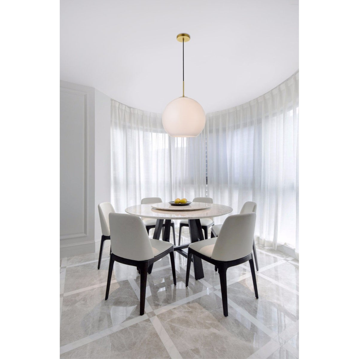 Refined style with a practical design, Baxter hanging pendant lamps bring cosmopolitan sophistication anywhere, especially to an entryway, office, bathroom, bedroom, or kitchen. The smooth iron frame features a disk-shaped canopy and comes in a brass finish. An adjustable black cord allows you to vary the hanging height from 20 to 73 inches. The frosted white spherical glass shade remains open at the center to allow for effortless replacement of the filament-style bulb (not included). Living in the big city has never been this easy.Proposition 65 WARNING: This product can expose you chemicals including lead and lead compounds, which are known to the State of California to cause cancer and birth defects and other reproductive harm.. For more information go to: www.P65Warnings.ca.gov.