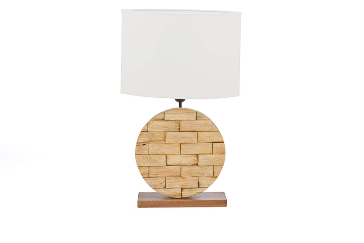 Illuminate your world with our Budalin Wood and Fabric Lamp. Constructed from genuine Southeast Asian bayur wood, this indoor lamp combines brick-like natural wood weave with a white shade for easy integration into a multitude of settings. The rectangle-and-circle combination offers exciting accent possibilities. The Budalin lamp expertly expresses the discount-furniture dharma.
