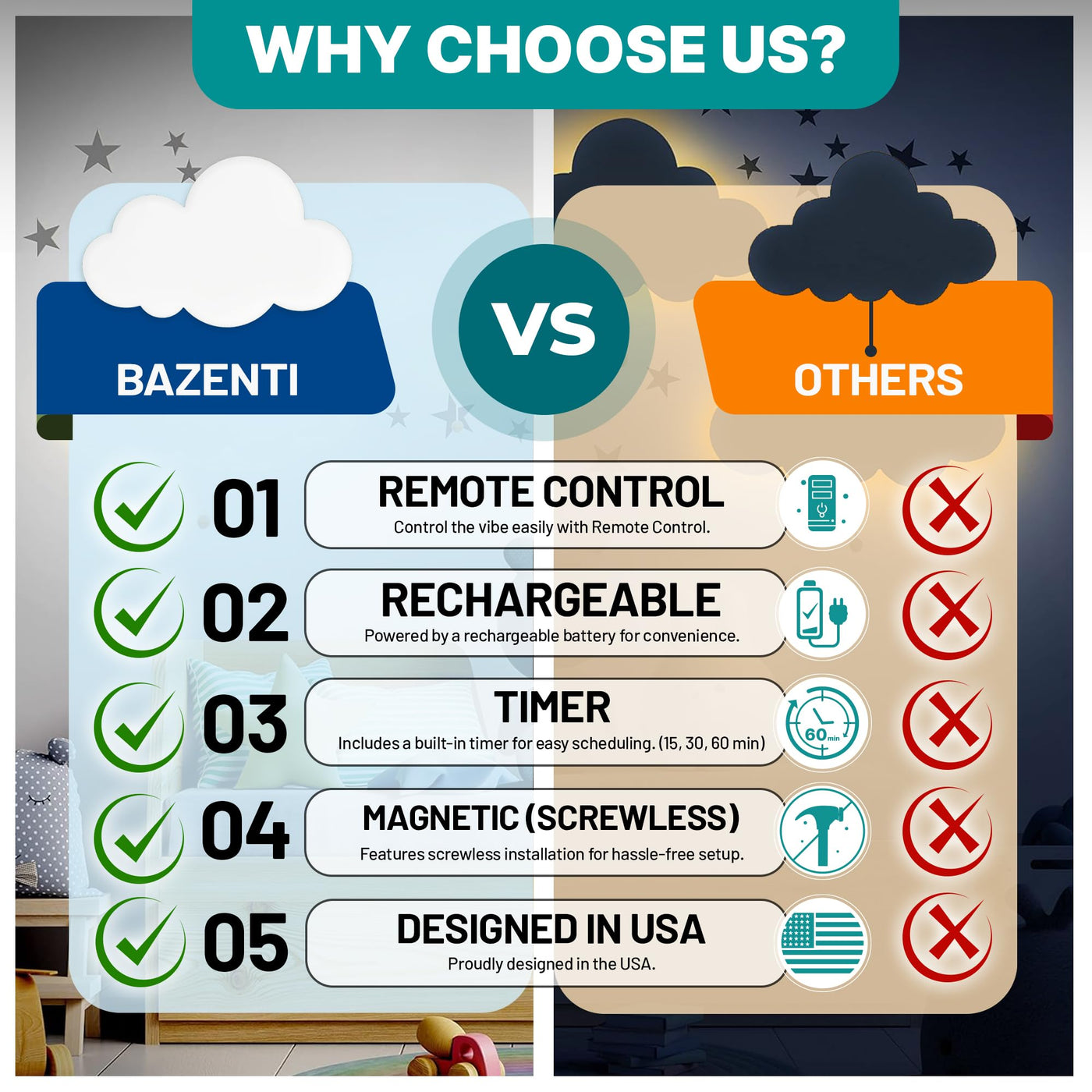 Transform your childs room with the Bazenti Floating Light, a battery operated lights solution that combines style, functionality, and charm. This rechargeable LED night light is designed for baby rooms, kids rooms, and baby nursery decor, creating a playful ambiance, perfect for peaceful nights. Pair it with glow in the dark stars for ceiling or wall for an nice bedtime atmosphere. This cloud shaped wireless lamp provides a soft, dimmable glow with three adjustable brightness levels, making it ideal as a toddler night light, a soothing nursery light, or a kids wall night light. Whether for bedtime stories, late-night feedings, or diaper changes, this rechargeable light offers the perfect amount of illumination to create a calming, peaceful environment. The Bazenti Floating Light features a magnetic light base, making it easy to install as a hanging cloud light or as part of a cloud light kit for wall. Its wireless, battery operated lights design keeps your nursery clutter free and safe, while touch controls and a timer function offer easy customization. Combine it with cloud wall decals or sticker for a magical, cloud-themed nursery setup. This portable and adaptable kids night light is perfect for kids rooms, bedrooms, or cloud-themed nurseries, adding ambient lighting and style to any space as a versatile cloud light. Crafted from durable, child-safe materials, the Bazenti non battery lamp are built to last and complement other cloud-themed decor, its a cute things that include cloud wall decals and wall stickers decor, while enhancing your childs room with warmth and creativity. Pair them with glow in the dark stars for the ceiling to create a magical nighttime sky. The Bazenti hanging lights, whether used as a cloud night light, a cloud lamp for bedrooms, or a cloud light for wall decor, brings fun and functionality to your childs space with star stickers. It? the perfect addition to create a whimsical, comforting atmosphere surrounded by clouds.