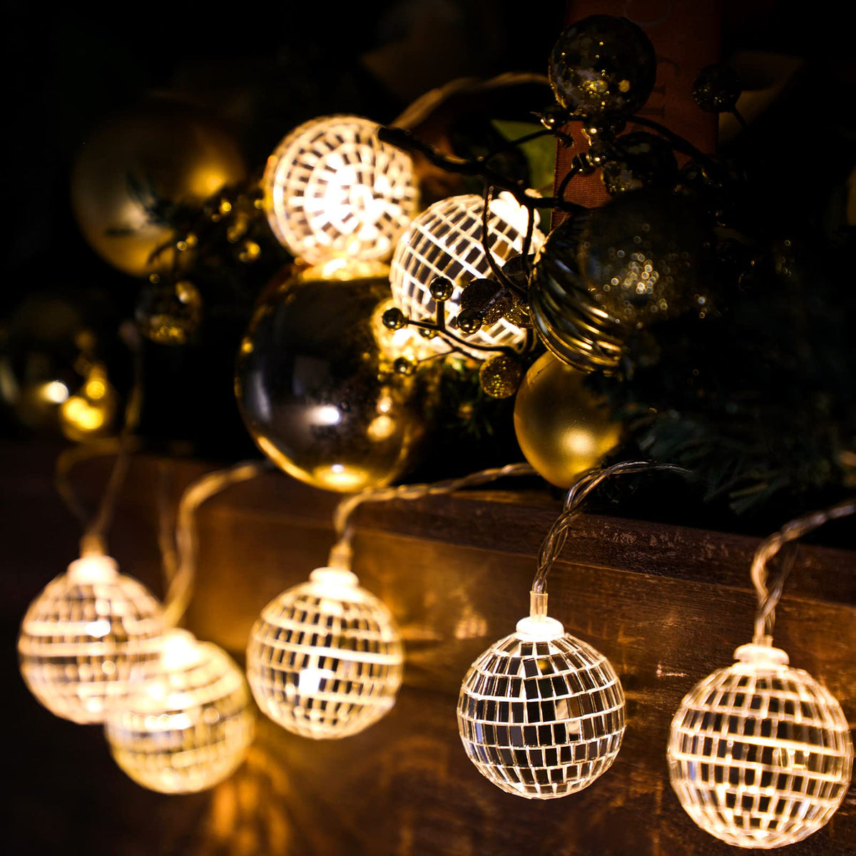 Q: What color are the lights in the disco ball string?A: The lights in the BBTO disco ball string are warm white, adding a charming atmosphere to any celebration.