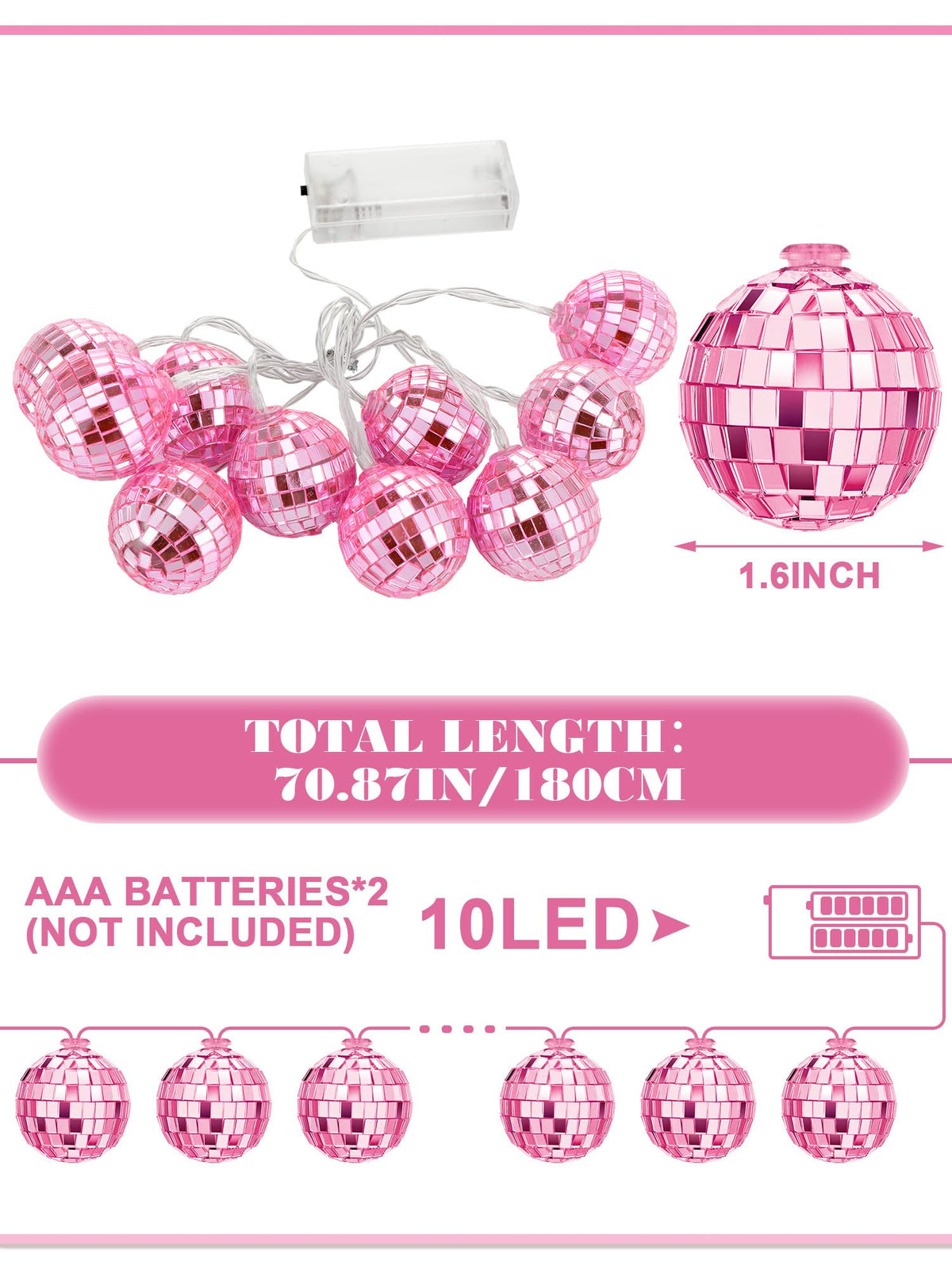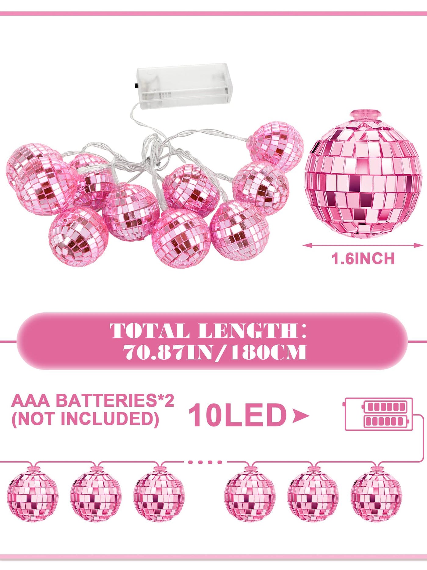 Features: Diy Experience: The Christmas Disco Ball Is Easy To Install. You Can Make Diy Designs Almost Anywhere. Take These Battery Powered Strings Of Lights To The Park For An Evening Picnic That Will Be Very Impressive. Your Kids Will Love Them. Wide Application: Disco Party Decorations Are Widely Applied In Balconies Gardens Courtyards Lawns Porches Gates Yards Homes Windows Children S Rooms Weddings Parties Christmas Parties And So On. They Can Not Only Add Charming Atmosphere Make Your Party Atmosphere More Active And Lively But Also Can Be Shooting Props Specifications: Material: Led Copper Wire Pc Color: Rose Pink Size: About 4 Cm/ 1.57 Inches In Diameter Package Includes: 1 X Christmas Disco Ball Strip Notes: Manual Measurement Please Allow Slight Errors On Size. The Color May Exist A Slight Difference Due To Different Screen Displays. Winding Risk May Exist Please Keep Away From Little Kids