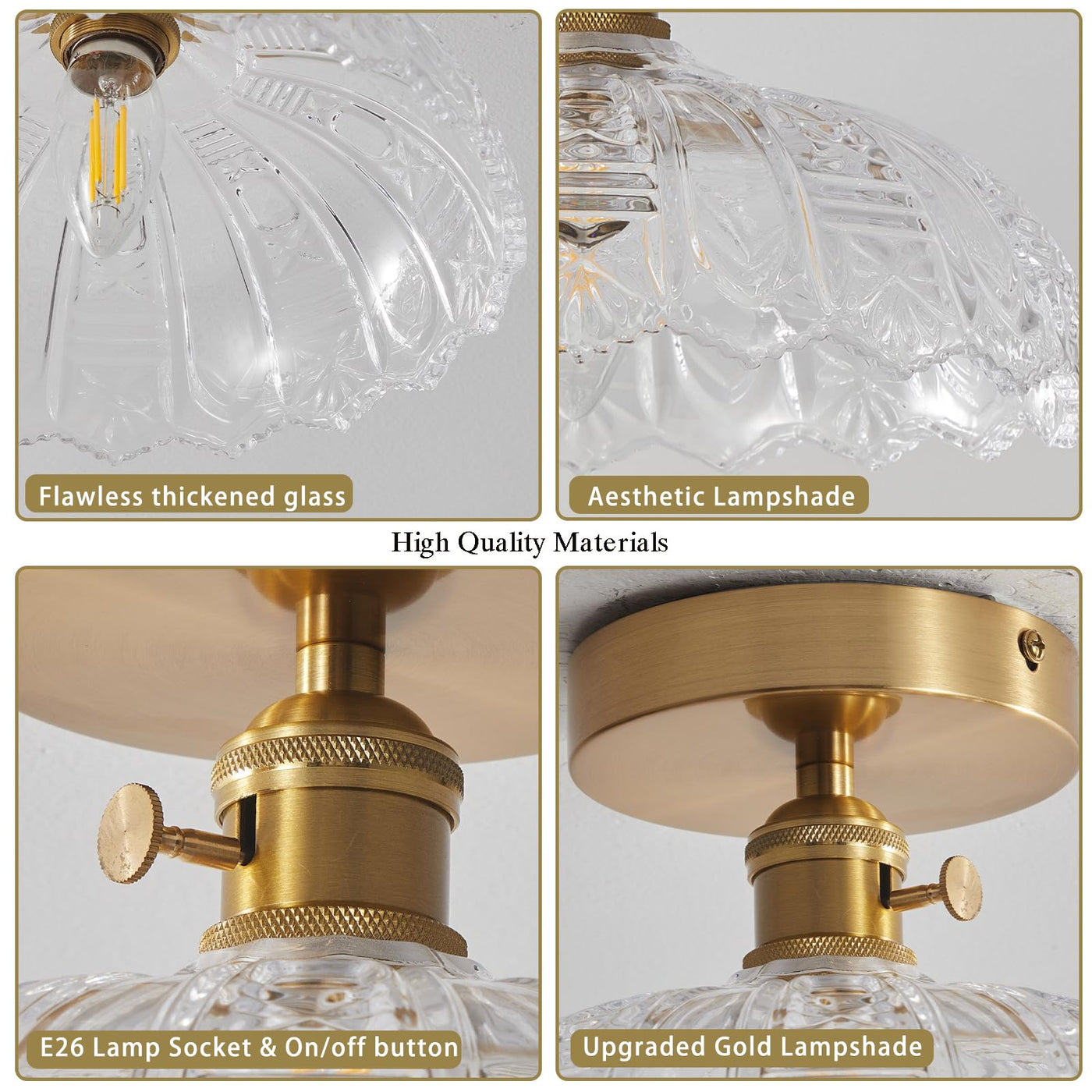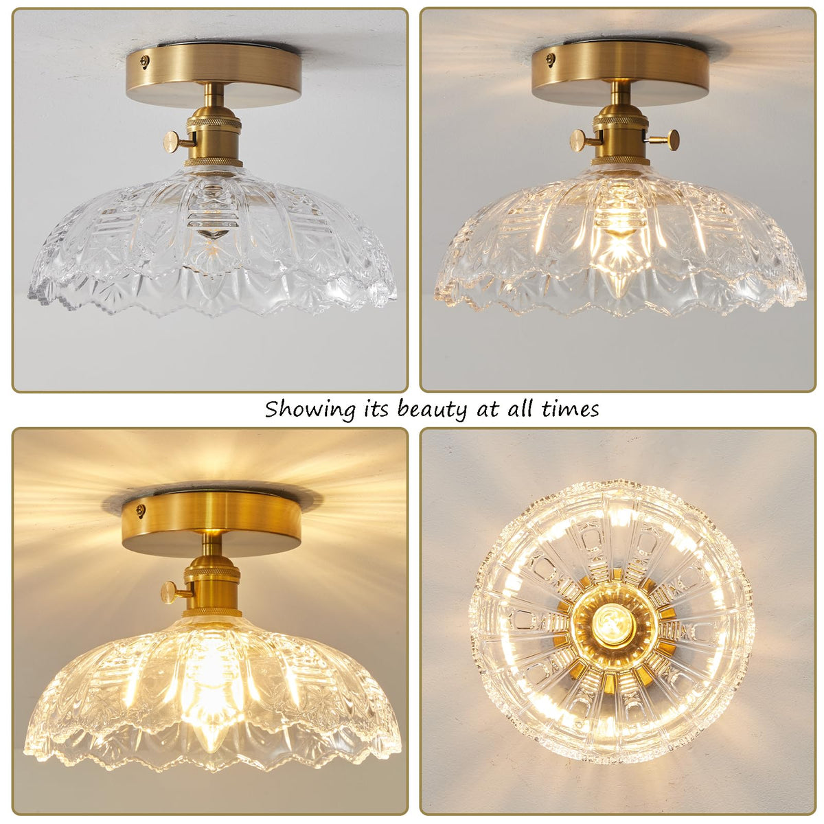 Bcgmyln Semi Flush Mount Ceiling Light, Gold Vintage Hallway Light Fixture With Clear Water Lily Glass Lampshade Brass Modern Ce