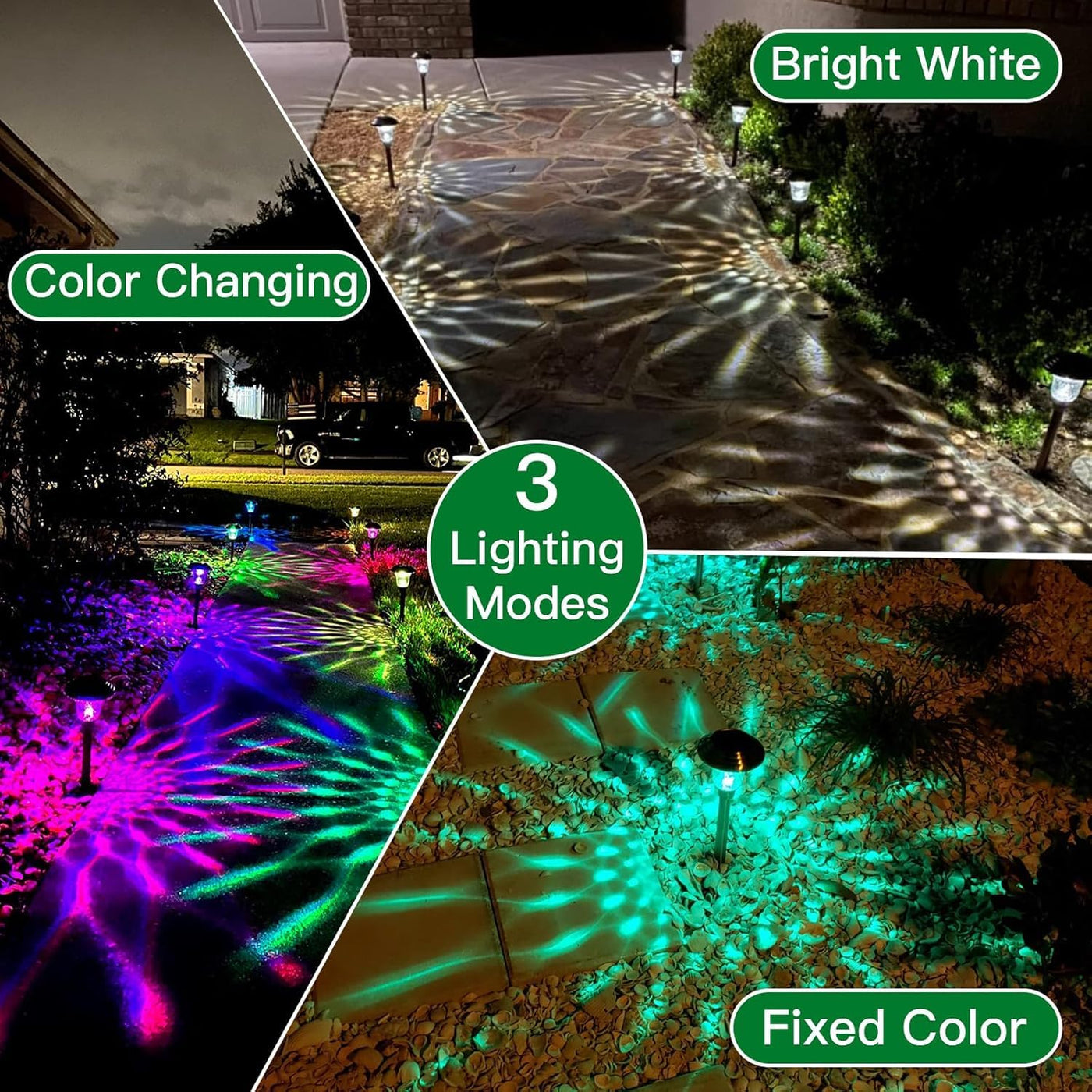 Q: What are the different lighting modes available for these solar lights?A: The Beau Jardin solar pathway lights feature three lighting modes: Bright White, Multicolor, and Fixed Color, allowing you to customize the ambiance for your garden or pathway.