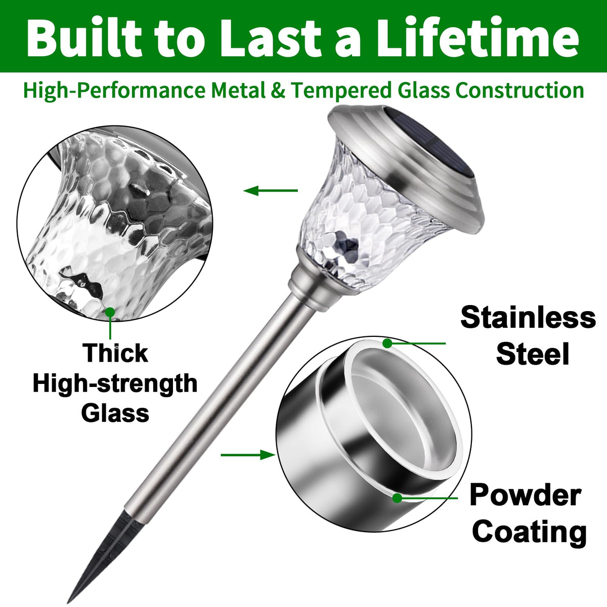 Q: What materials are the solar pathway lights made from?A: The solar pathway lights are constructed from stainless steel and glass, ensuring durability and a modern aesthetic.