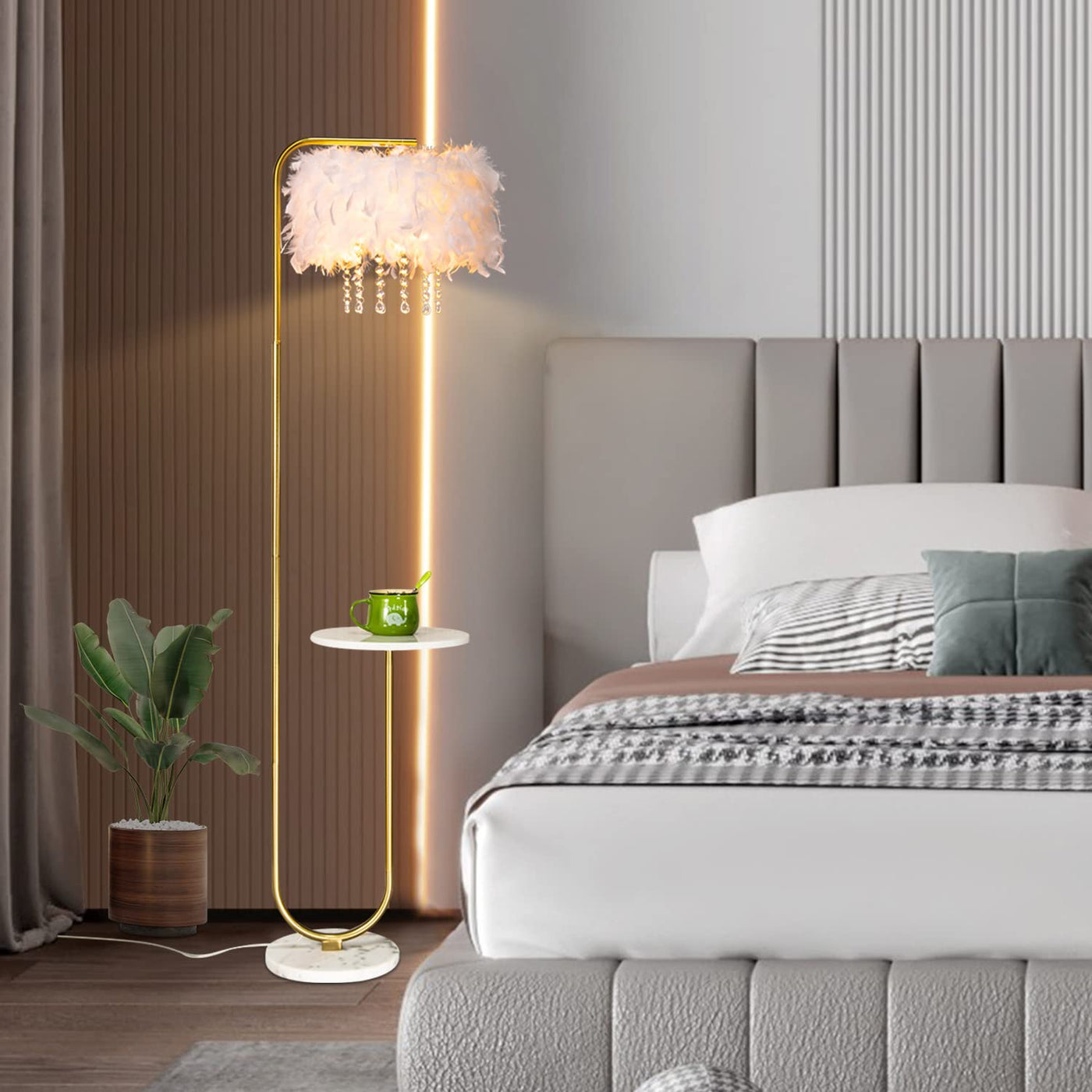 Beaysyty Unique Led White Feather Floor Lamp With Tray,Ostrich Feather Stand Lamp,Living Room Bedroom Office Shop Window Decorat