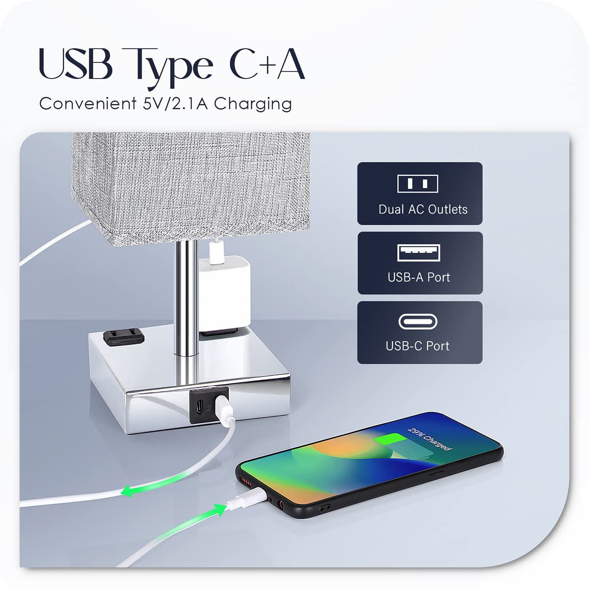Q: Can I charge my devices while the lamp is off?A: Yes, the bedside lamp is equipped with a USB C port, a USB A port (5V/2.1A), and two AC outlets that allow you to charge your devices even when the lamp is not turned on.