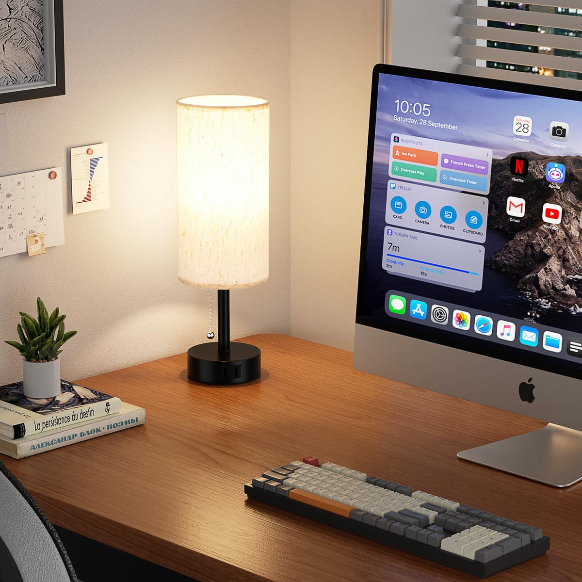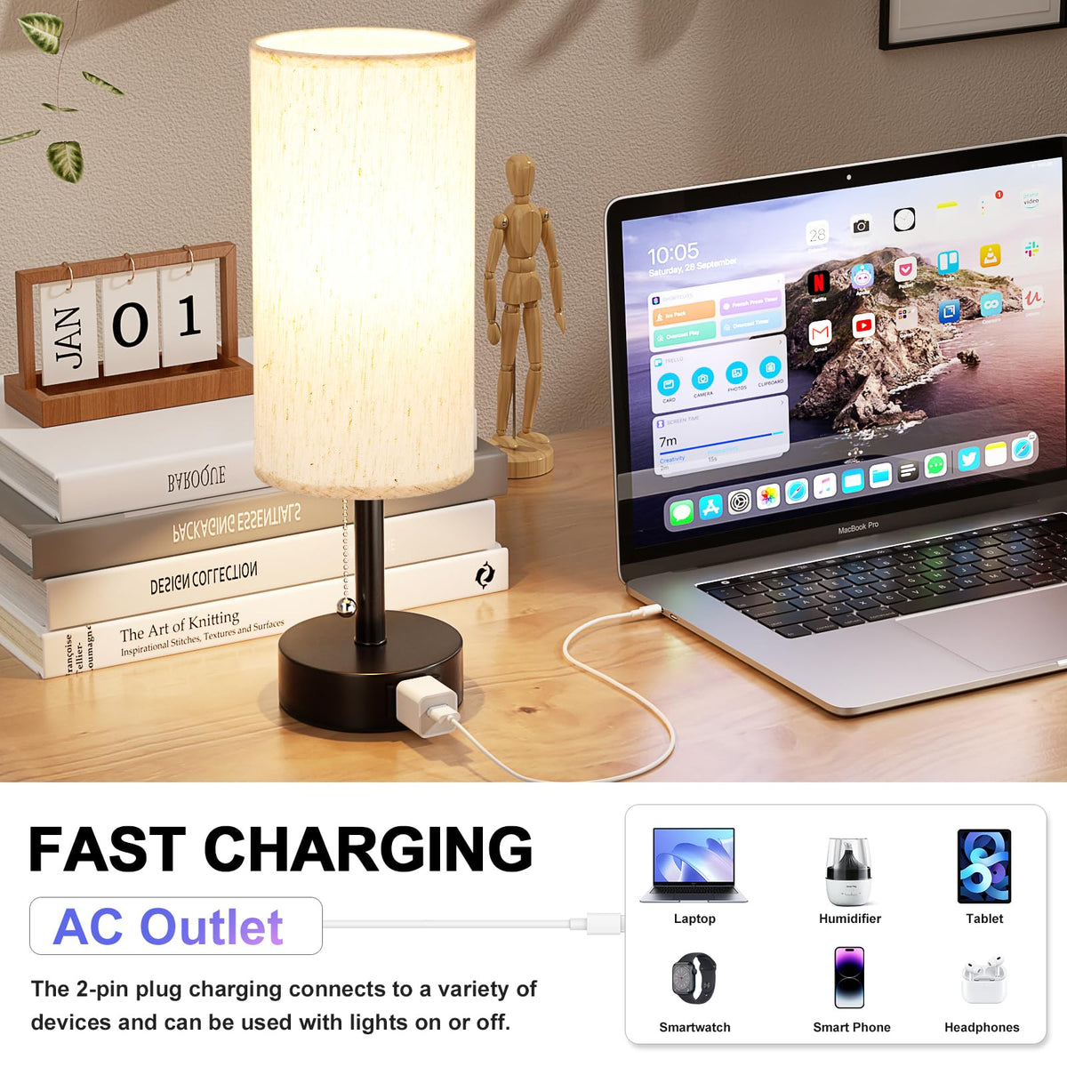 Q: Does the bedside lamp have a charging port?A: Yes, this bedside table lamp is equipped with a practical AC outlet charging port. It allows you to charge devices like cell phones, tablets, and laptops without needing additional power outlets, keeping your space tidy and organized.