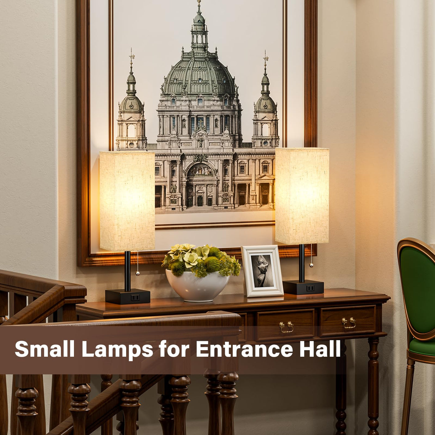 Q: What is the design style of these bedside lamps?A: The lamps feature a minimalistic design with a classic black metal base and a cream flaxen fabric shade, making them suitable for various settings including bedrooms, living rooms, and office spaces.