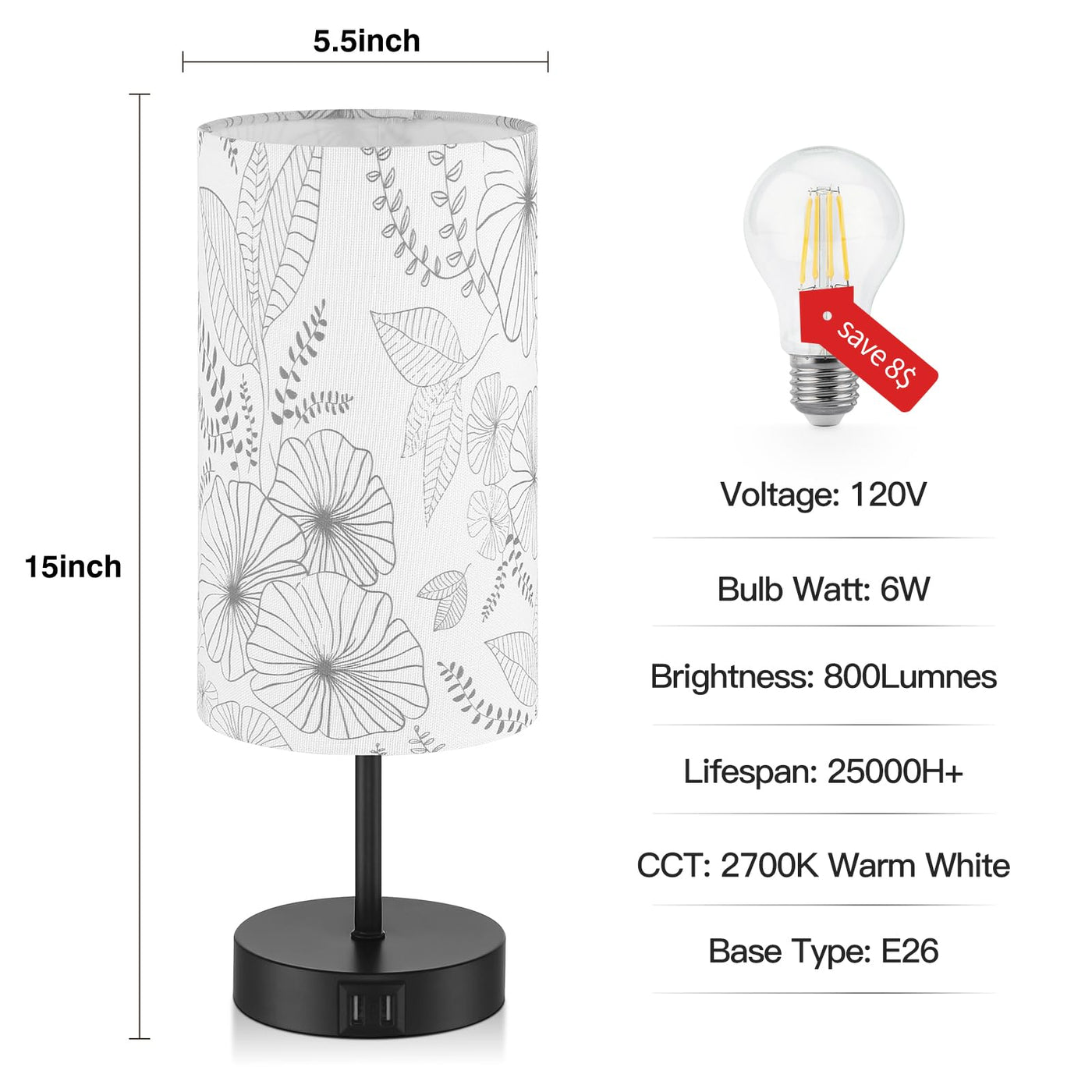 Q: What type of light bulb is included with the lamp?A: The lamp comes with a 6W E26 LED bulb that emits a warm white light at 2700K. This energy-efficient bulb has a long lifespan and is designed to protect your eyes from harsh lighting.