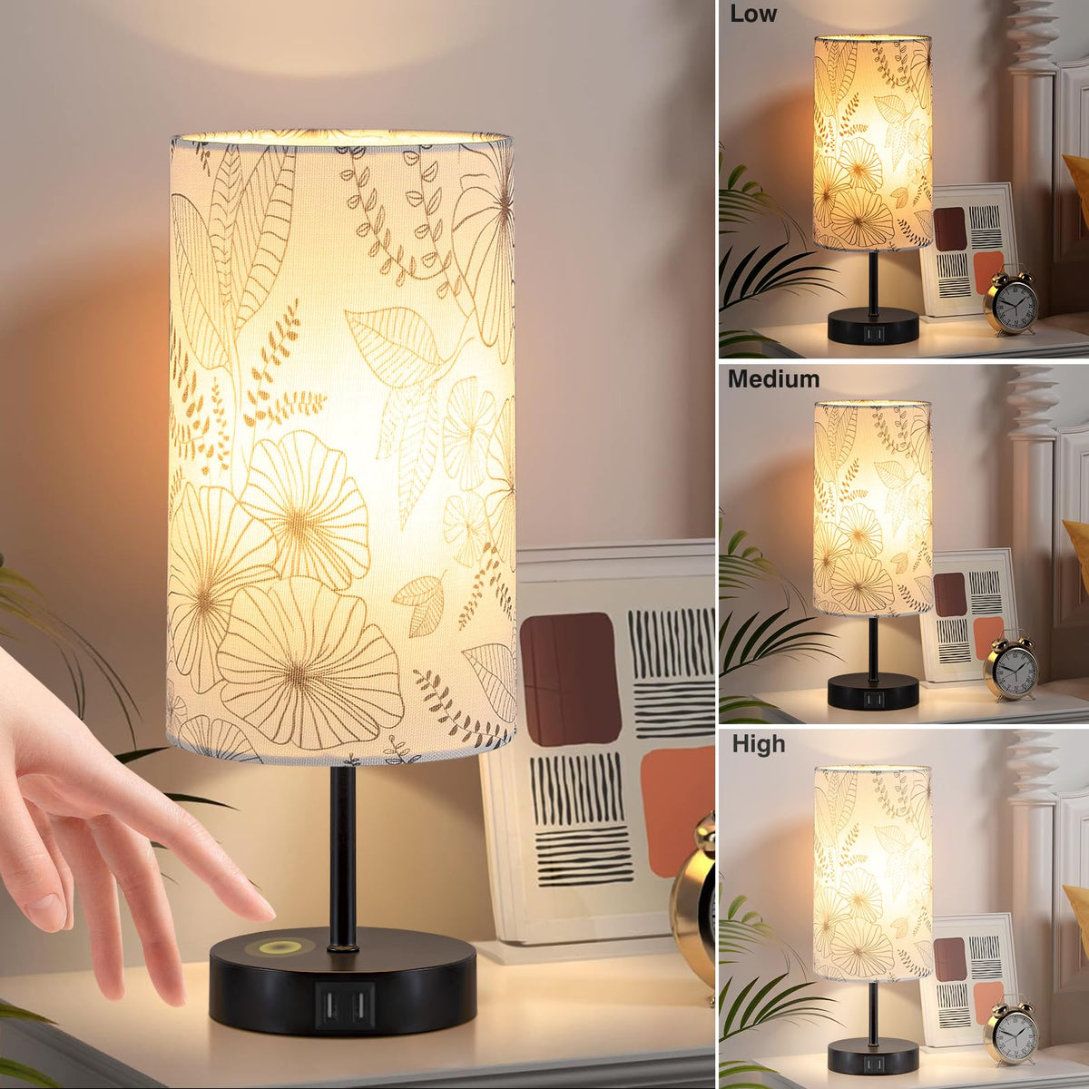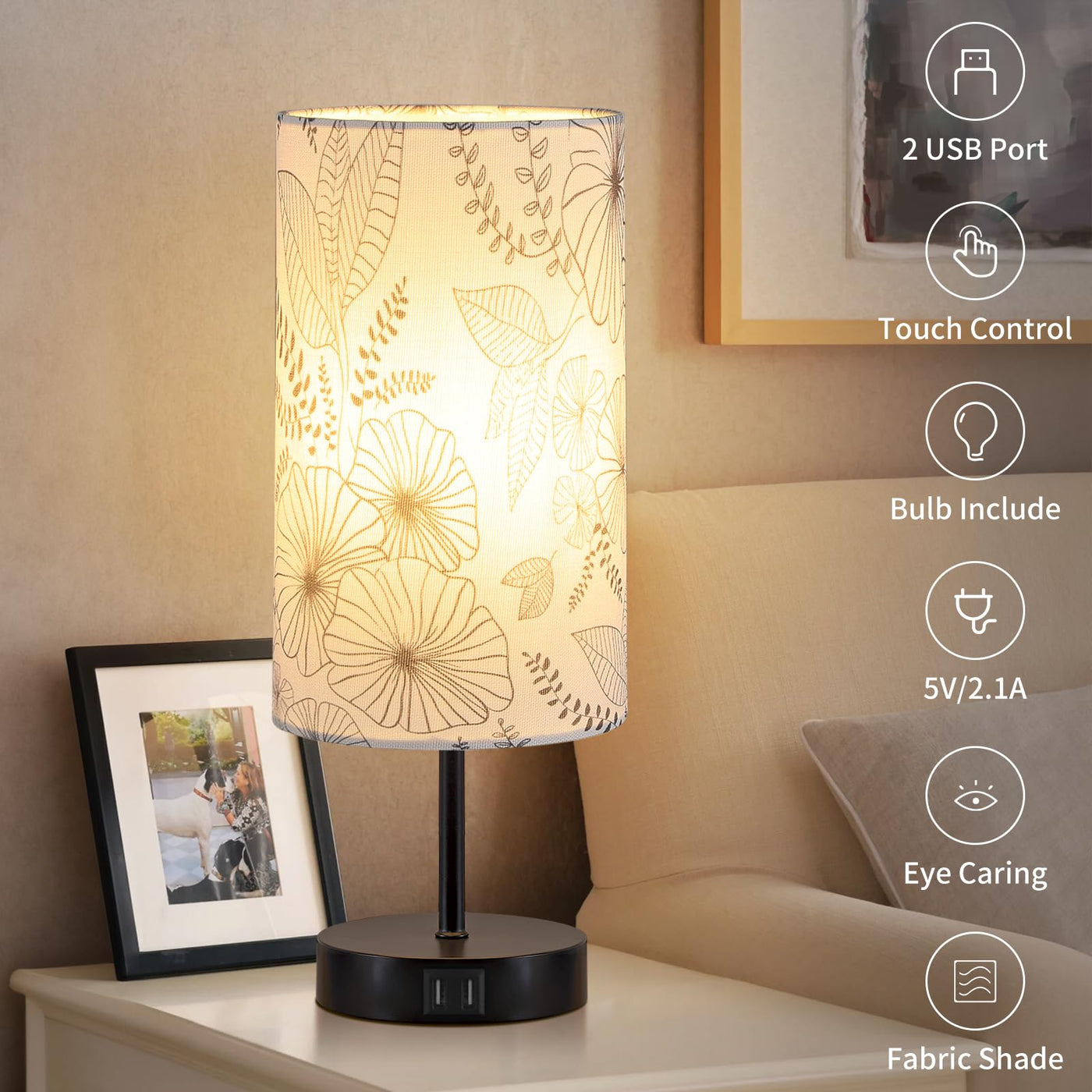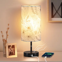 Bedside Touch Lamp With 2 Usb Ports, Modern 3 Way Dimmable Small Lamp With Flower Fabric Shade, Nightstand Lamp For Living Room