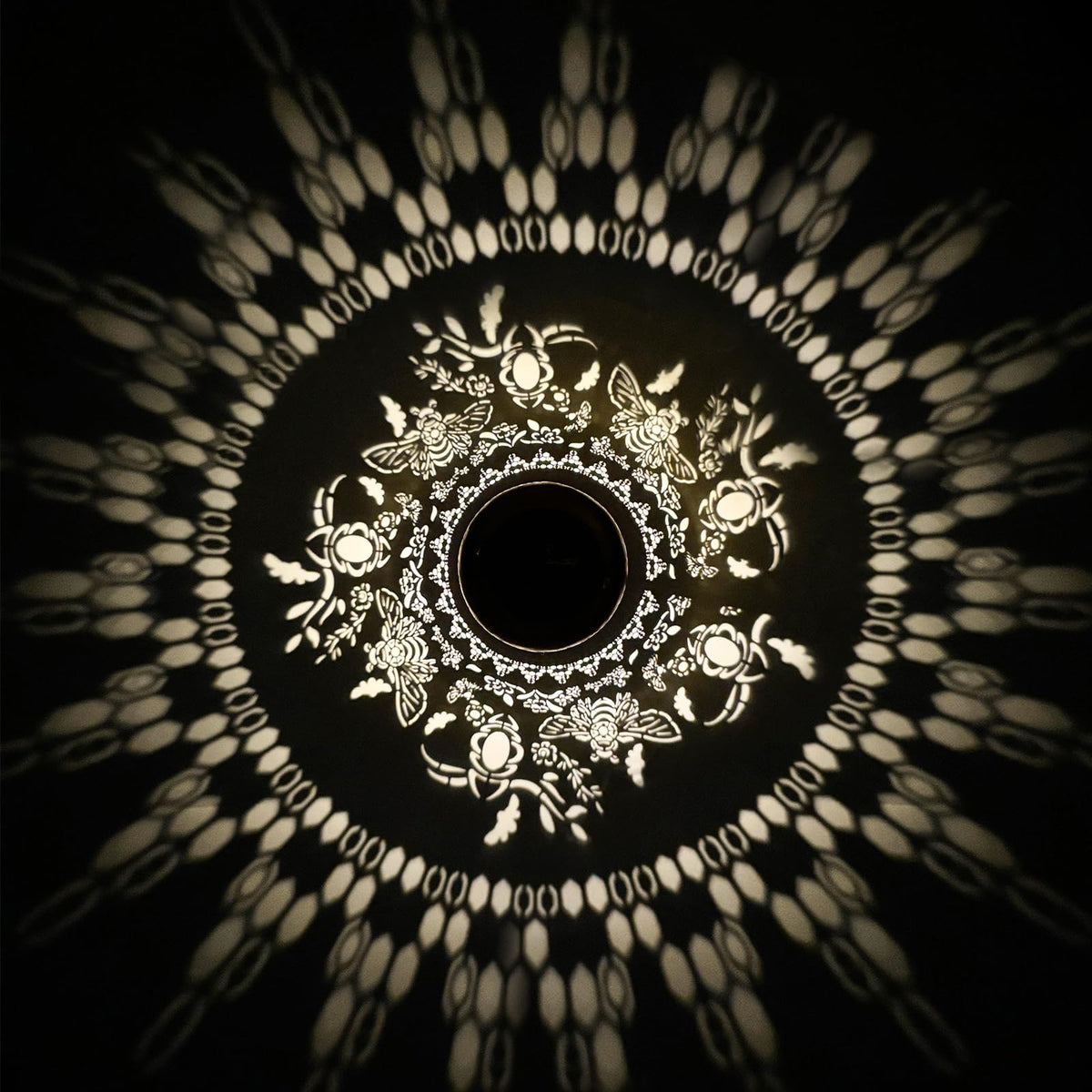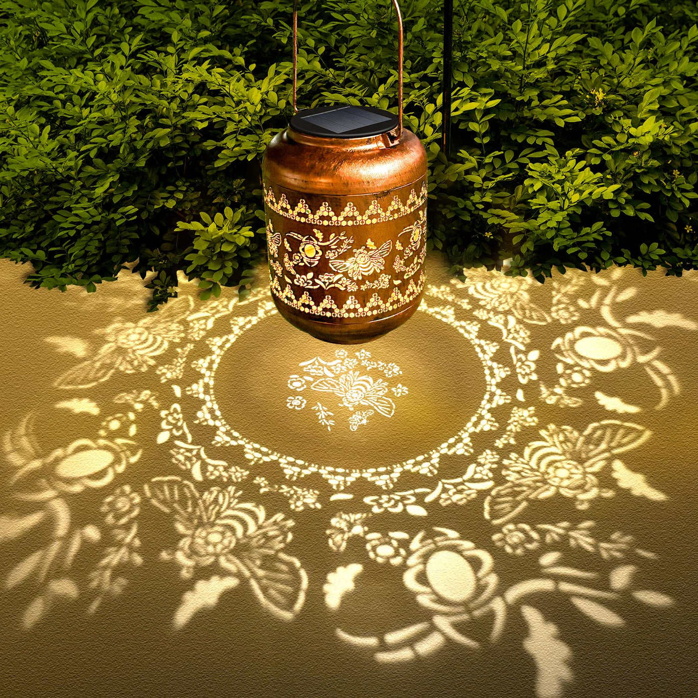 Q: What are the main features of the solar hanging lantern?A: The solar hanging lantern features a unique bee design that projects vibrant patterns in the dark, creating a warm atmosphere. It is made of durable, thickened metal, ensuring it is waterproof and can withstand various weather conditions. The lantern is equipped with a high-efficiency solar panel that charges during the day and provides light for at least 8 hours at night.