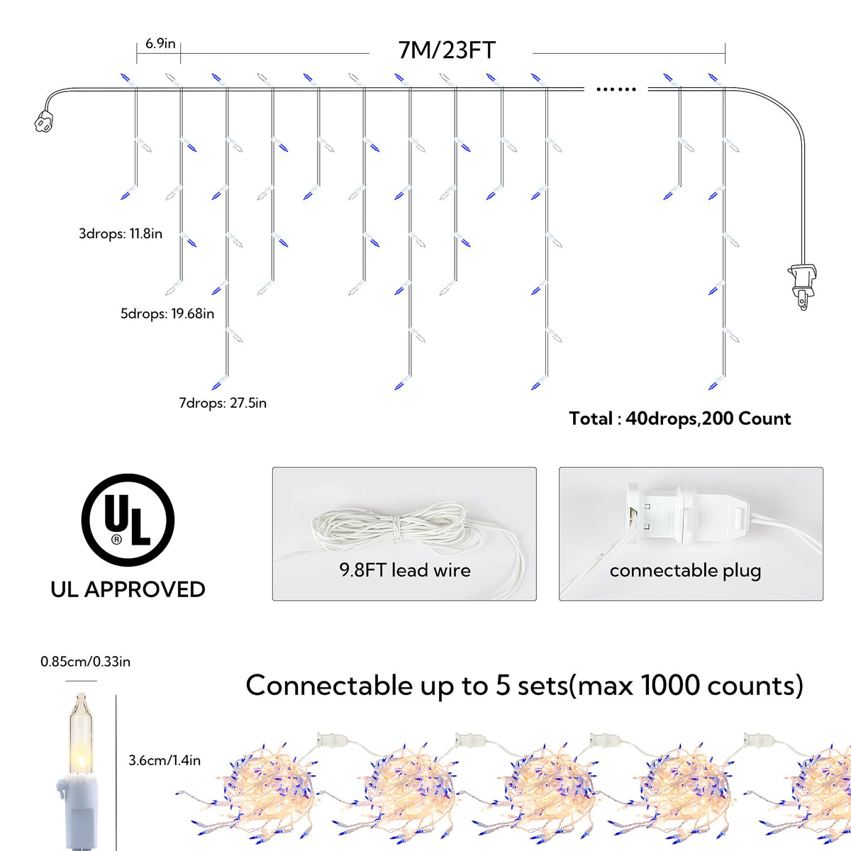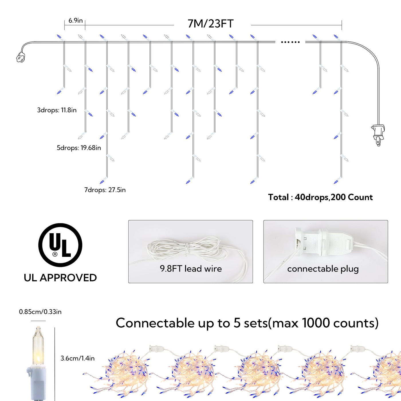 Package Including: 1 X 200 Count Blue & Clear Icicle Lights, 25 X Zip Tie, 4 X Spare Bulbs, 4 X Spare Fuses