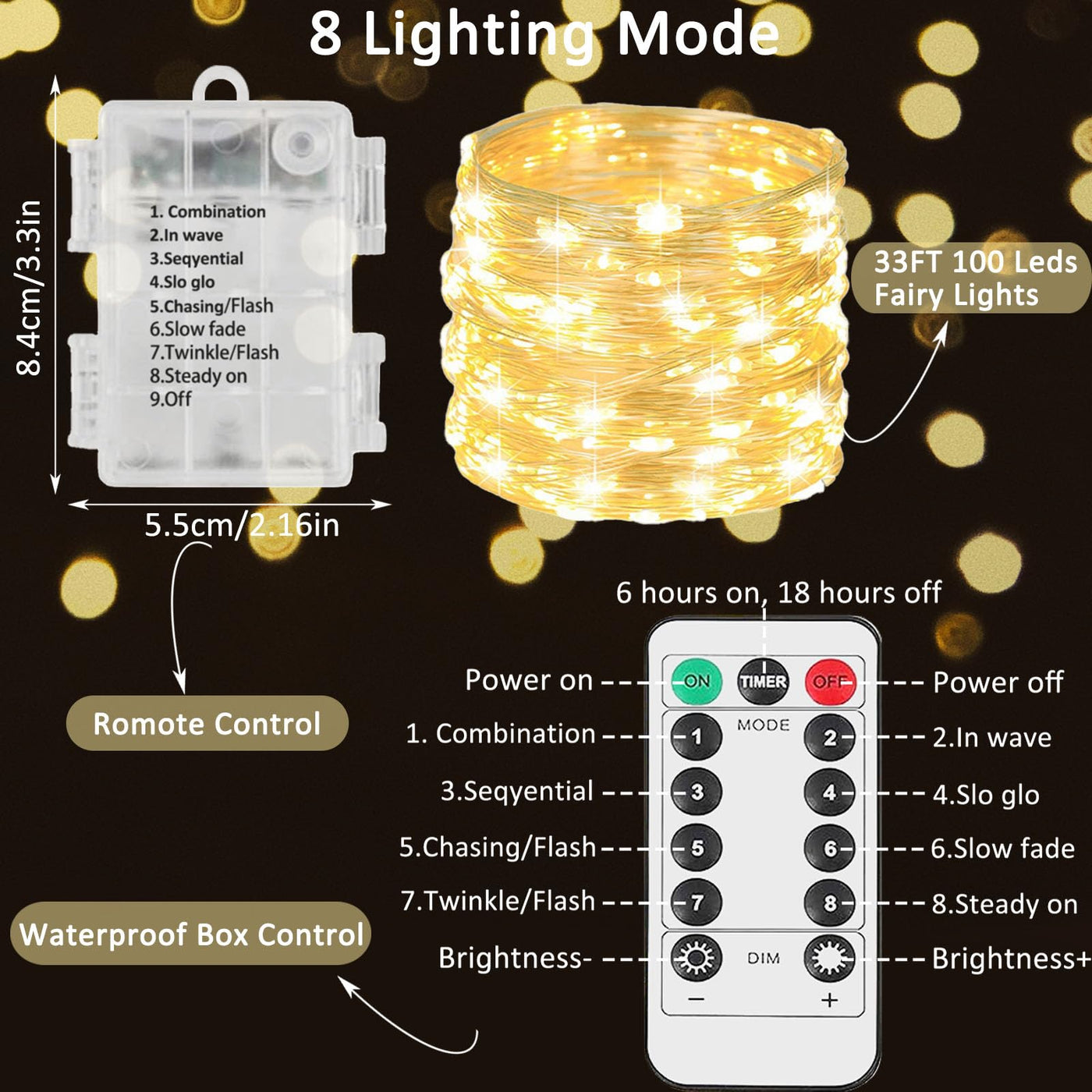 Beieverluck 10 Pack 33Ft 100 Led Fairy Lights Battery Operated Fairy Lights With Remote And Timer Waterproof String Lights Outdoor Indoor For Bedroom Wedding Christmas Decorations, Warm White