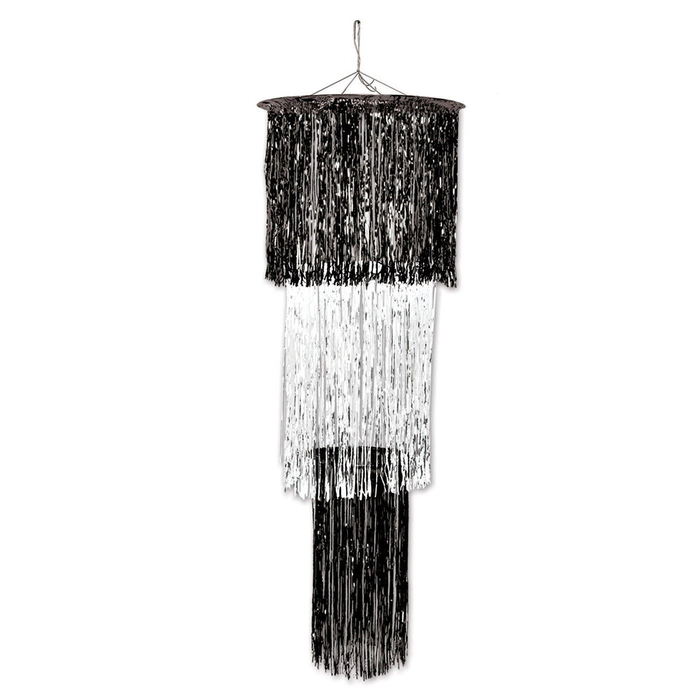 Beistle 57510-BKW 3-Tier Shimmering Chandelier. The package contains 1 shimmering chandelier. This chandelier is made of black and white metallic strands. It measures 4 feet long. A cord is attached at the top for hanging. This shimmering chandelier is a great hanging decoration for an Awards Night or New Years party!.