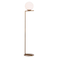 Pure Geometry. A modern round globe balances on a simple linear plane to create this luminous floor lamp. Its minimalist silhouette perfectly compliments the most modern spaces and will add simplicity to a more eclectic mix. Evenly distributes light to fill any room with a perfect glow. Place it in an empty corner or next to your favorite chair. Bulbs are not included, sold separately.